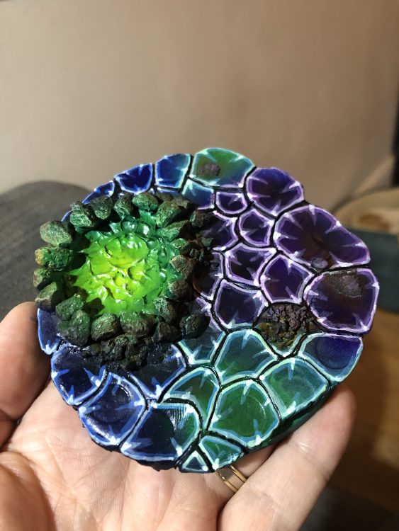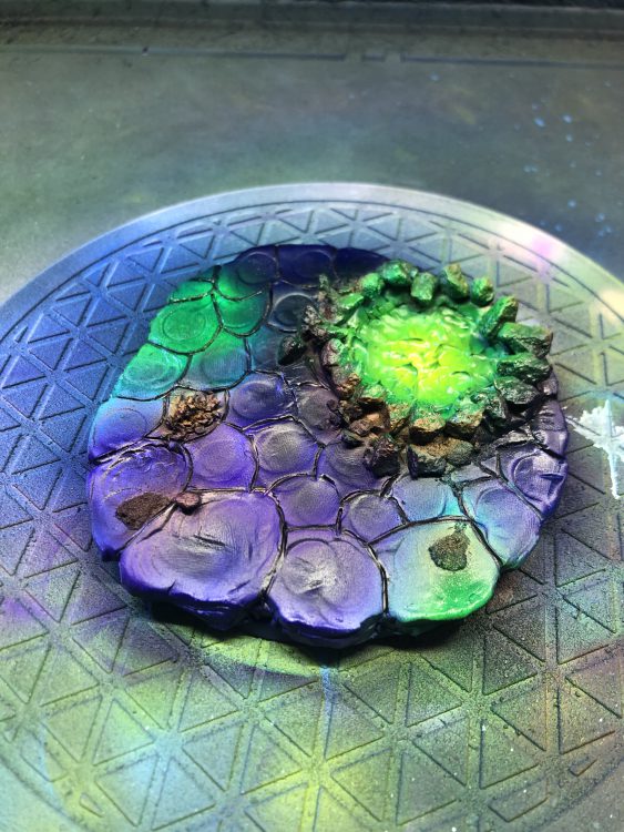 The base was my attempt to do something similar to the amazing painter Kaha (check her out, she is amazing https://www.instagram.com/kaha.katarzyna.gorska/?hl=en ) who makes some really striking bases out of carved wood. I'm not really much of a wood carver so I made mine out of Super Sculpy using a metal sculpting tool to cut out sections and using my finger to create depressions in each section before popping it in the oven to harden. I added a magical well using some stones and vallejo water texture before priming black then spraying the edges of the stone with white ink to create a gradient on each one before lining the cracks with black. Then I sprayed it with purple, blue and green inks, not worrying too much about how they blended together and airbrushed the fire with the same colours as the weapon.