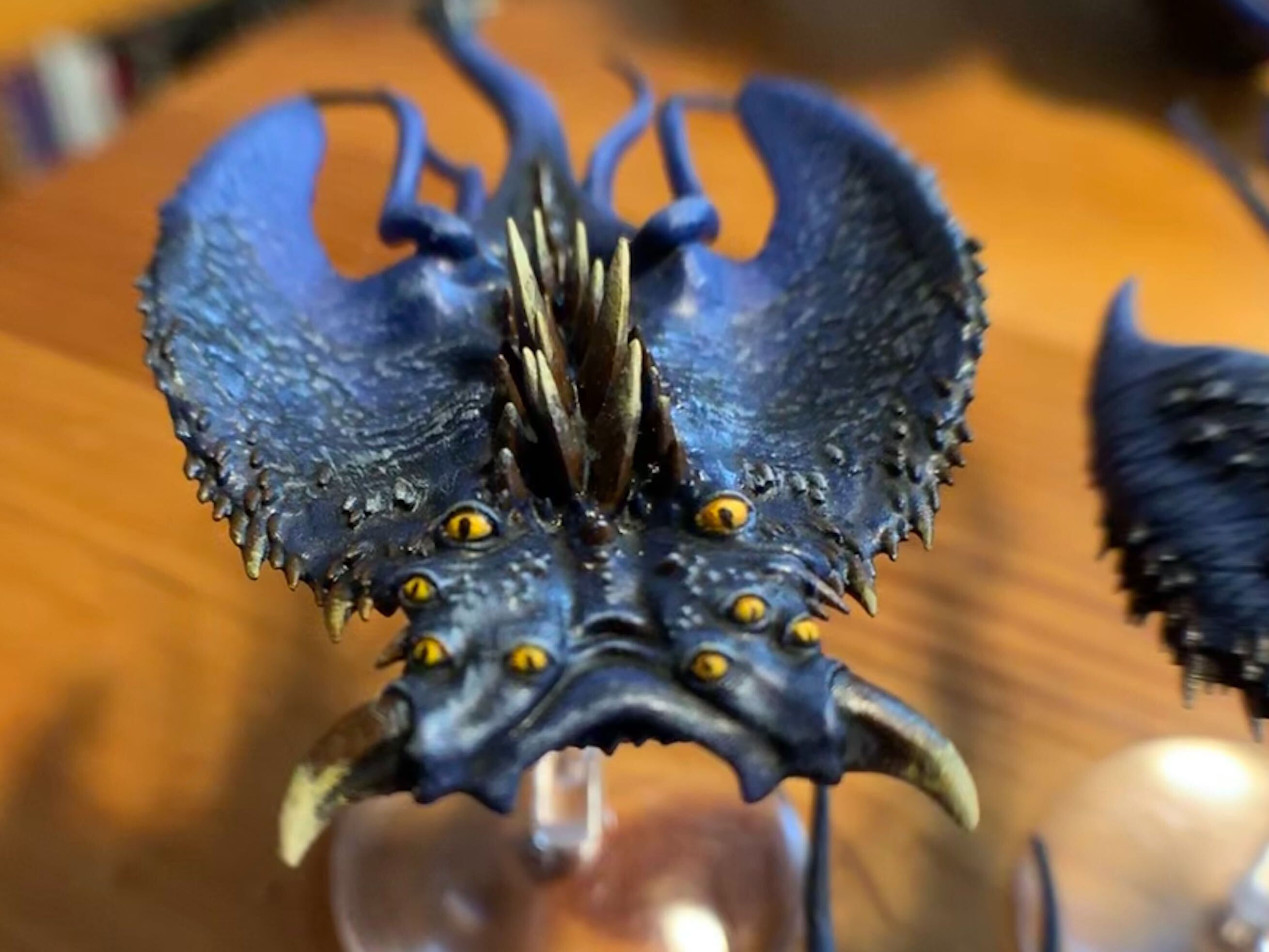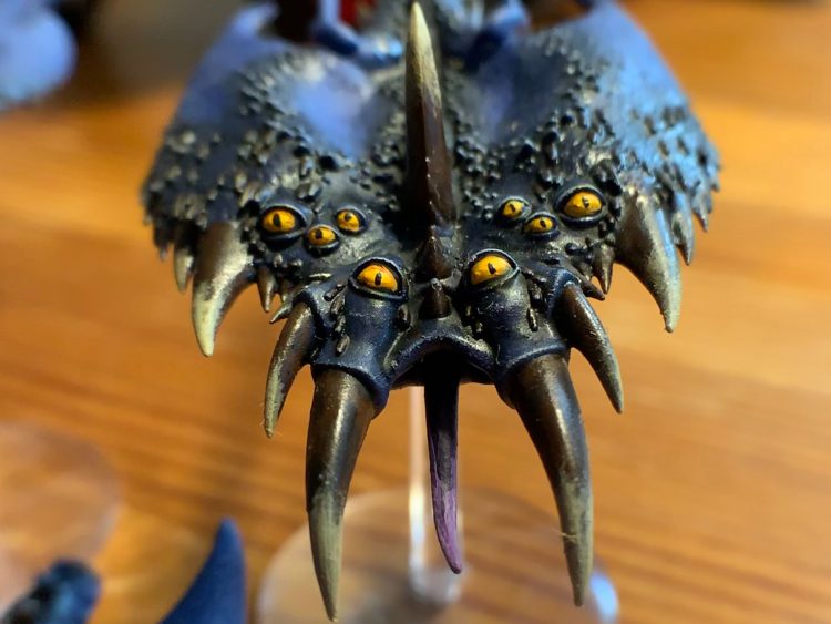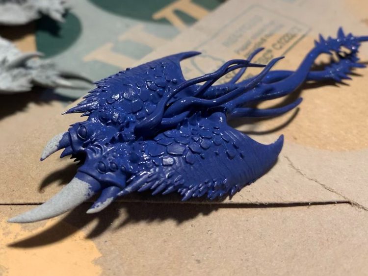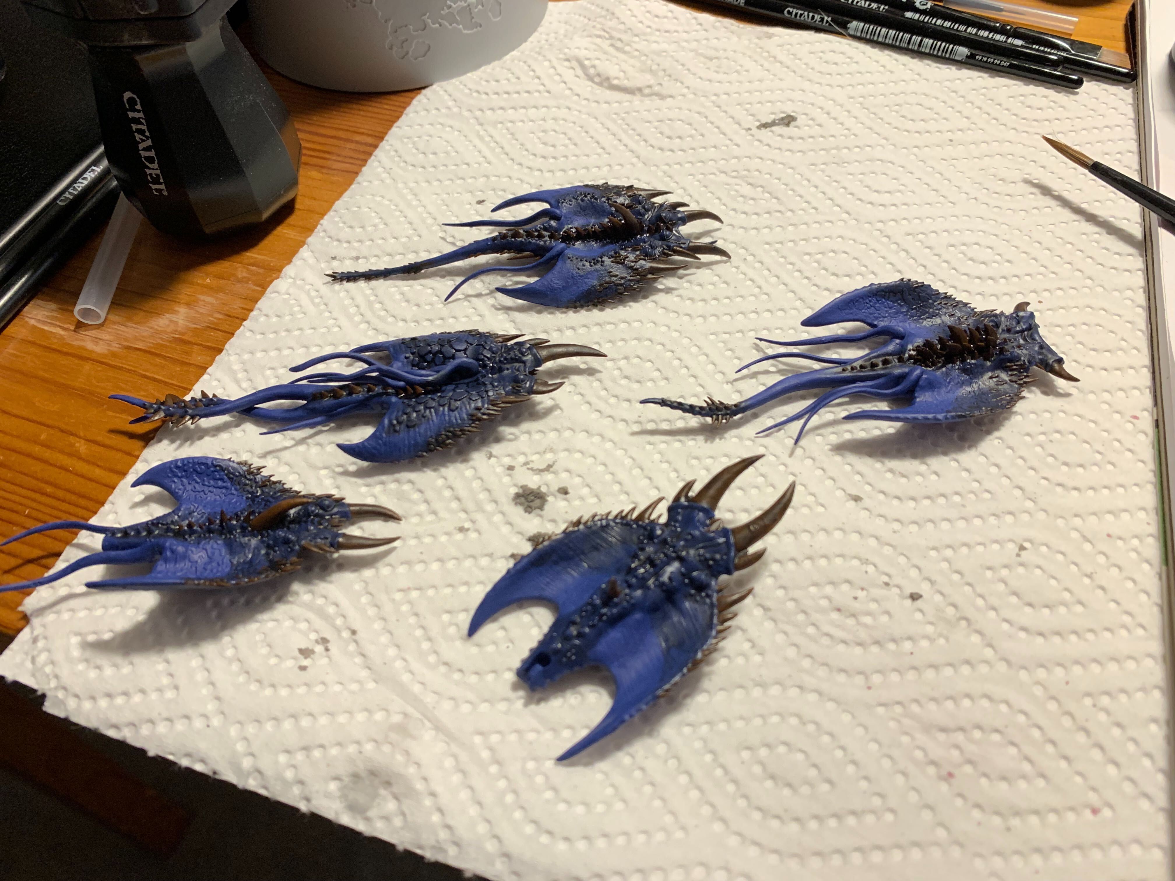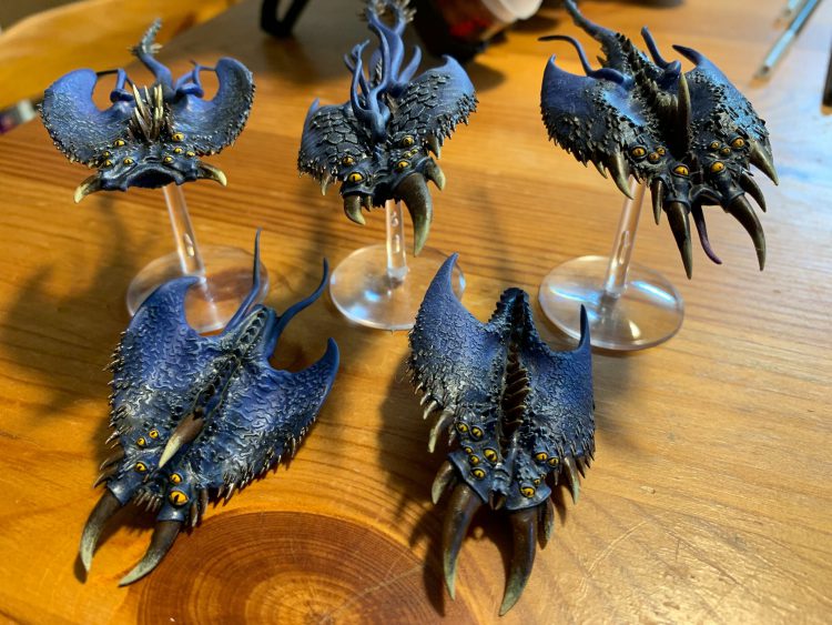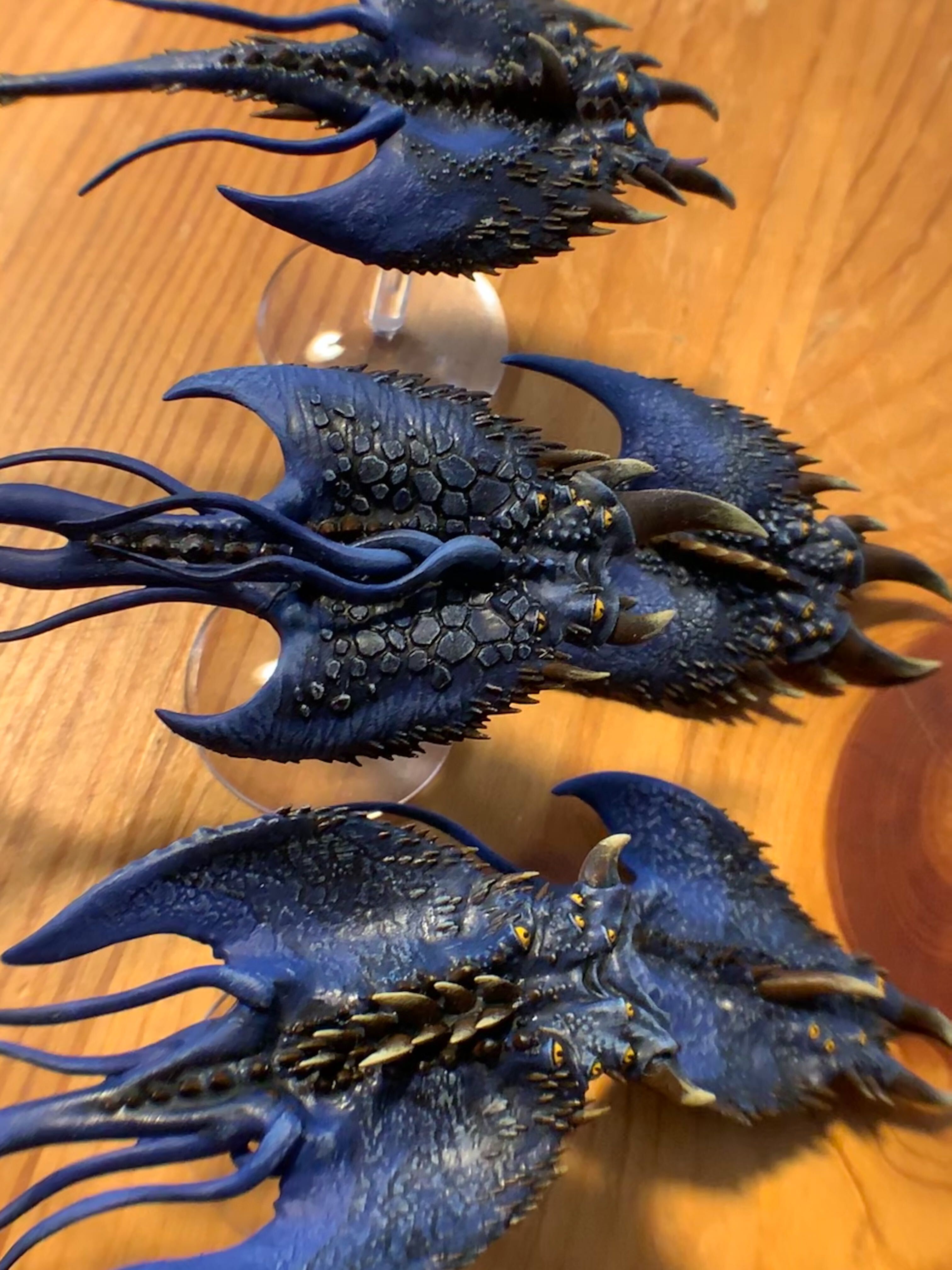 Unfortunately I don’t have any transition pictures between the shading and the finished models. I used a Calgar Blue to add some lighter shades of blue specifically on the tails/tentacles and then used a dry brush of Etherium Blue across their entire bodies focusing on catching the edges of any fleshy wrinkles or scales, really looking for some of those “happy little accidents”. Also looking for that light blue highlight along the ridges around eyes and their mouths. For the teeth/horns I layered in some Zamesi Desert on the very tips then applied a dry brush of Ushabti Bone. It wasn’t quite the effect I was looking for but it came out alright.