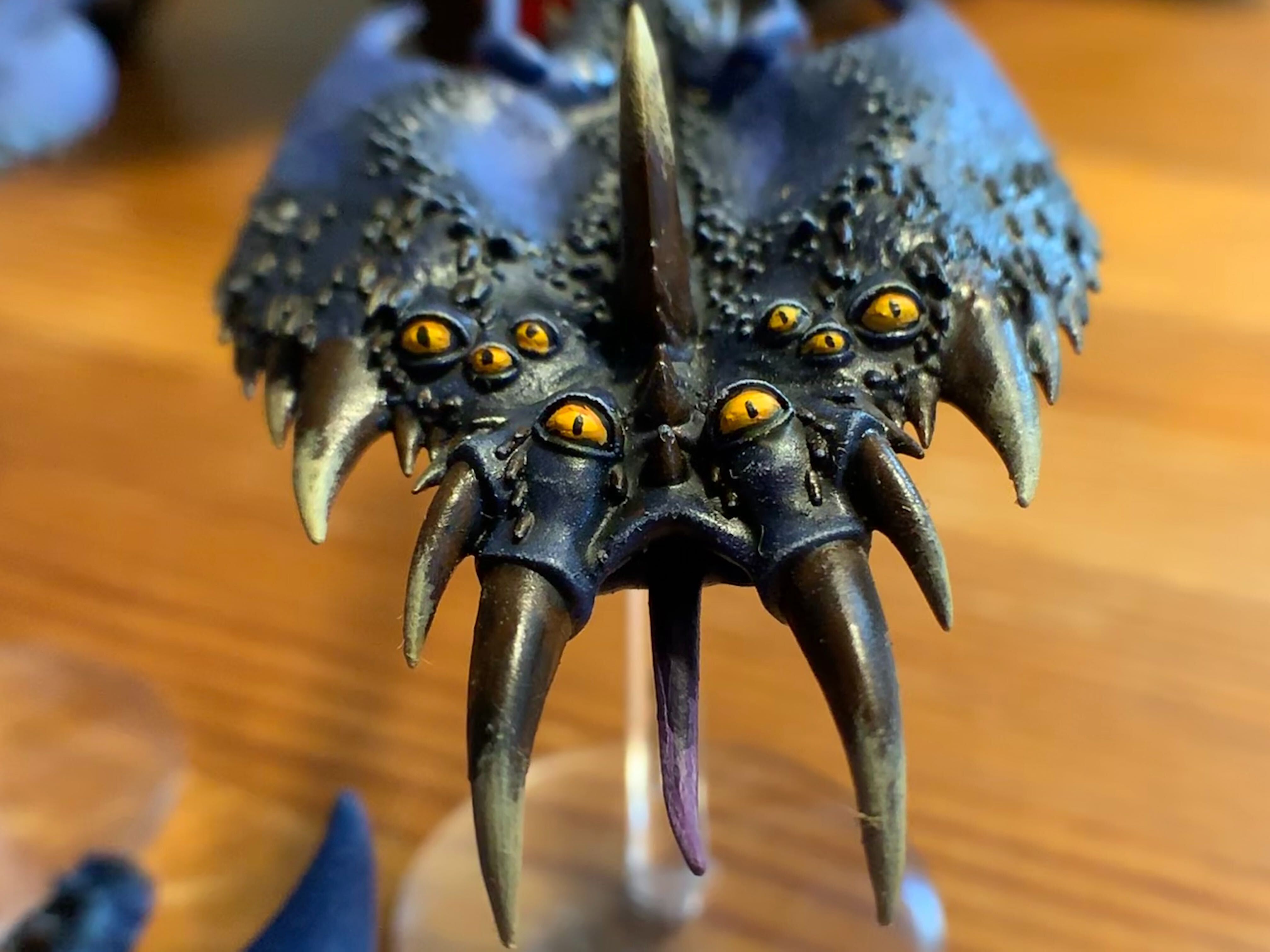 I am particularly a fan of screamers of Tzeentch and their myriad of creepy eyes. While I've stuck to a fairly traditional Tzeentch palette and painted the squad fairly uniformly, you can really go wild with colors here. Another neat bit about this kit is that it's very modular so you can mix and match teeth and horns and tails in a number of ways to create a fair number of unique models.