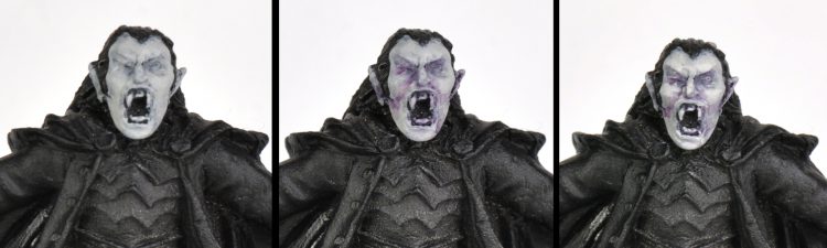 (1)The skin starts with a base coat of Stonewall Grey, followed by (2) a recess wash of Druchii Violet. The trick here is to carefully put the wash where you want it, rather than slathering the whole thing. So here it is in and around the eyes, ears, in the creases around nose and cheeks, and under cheekbones.