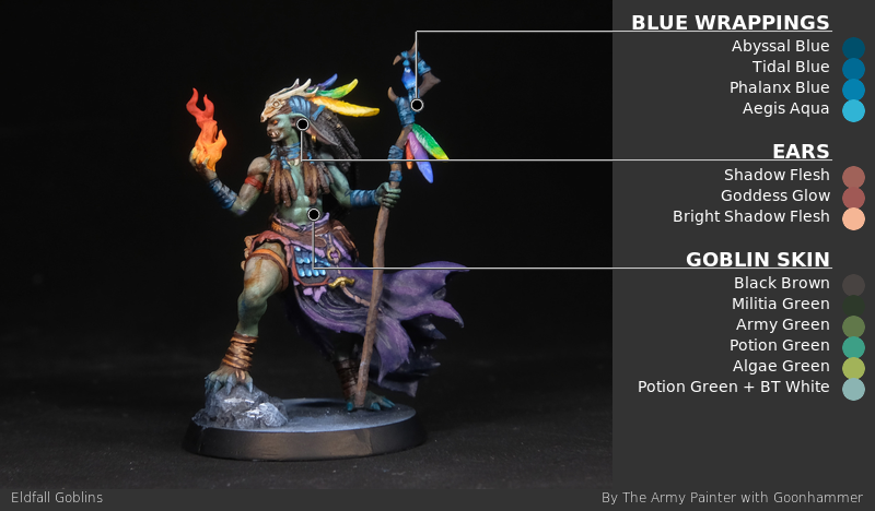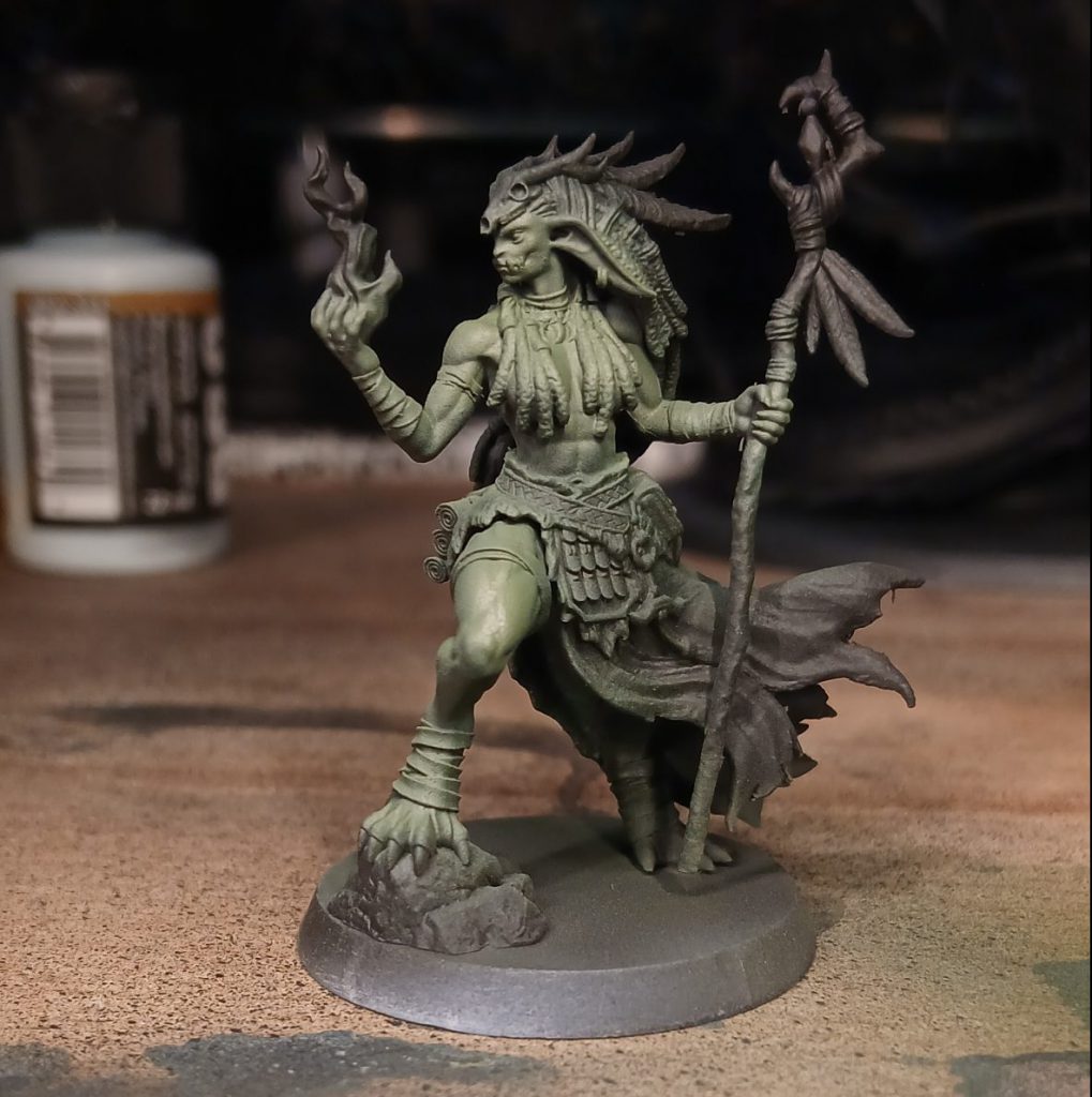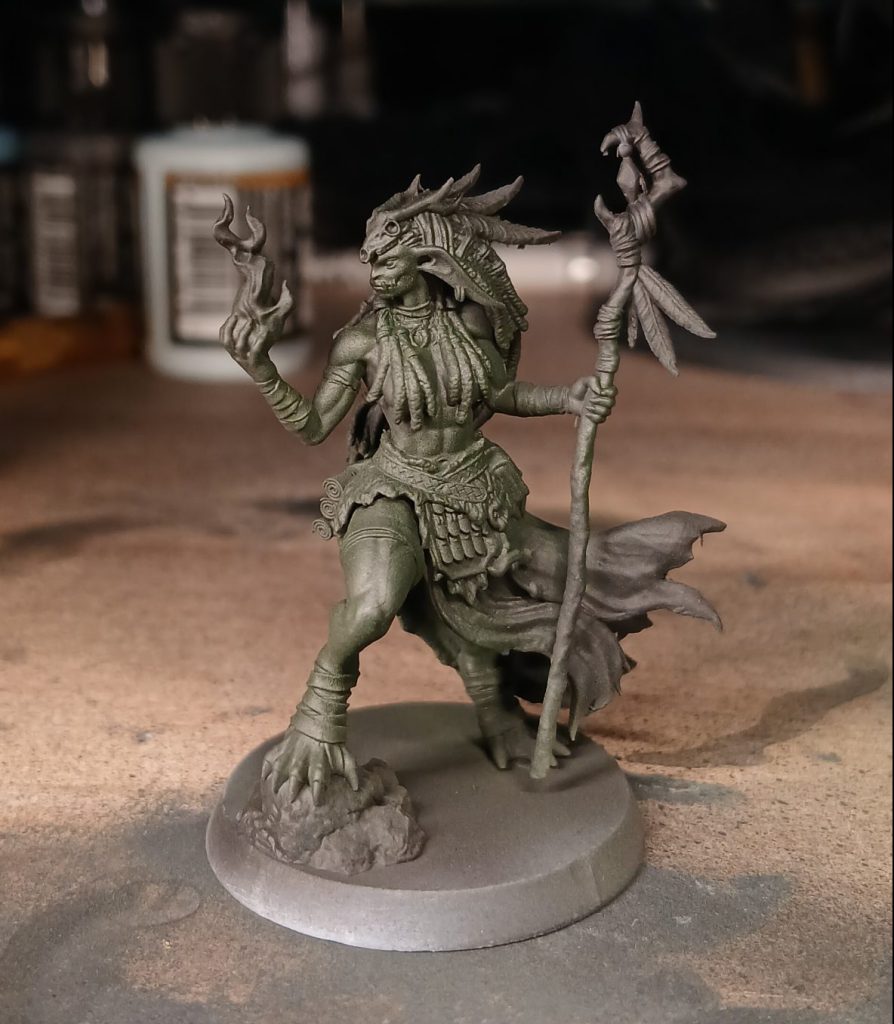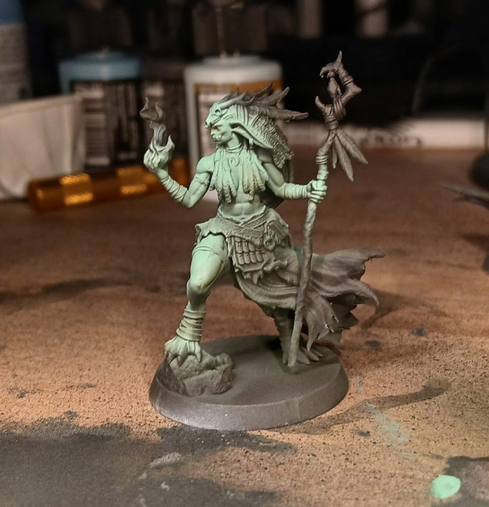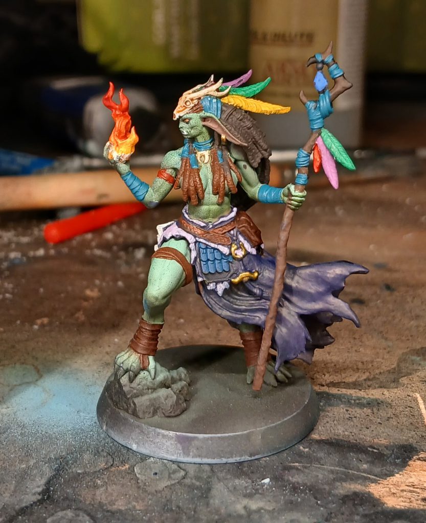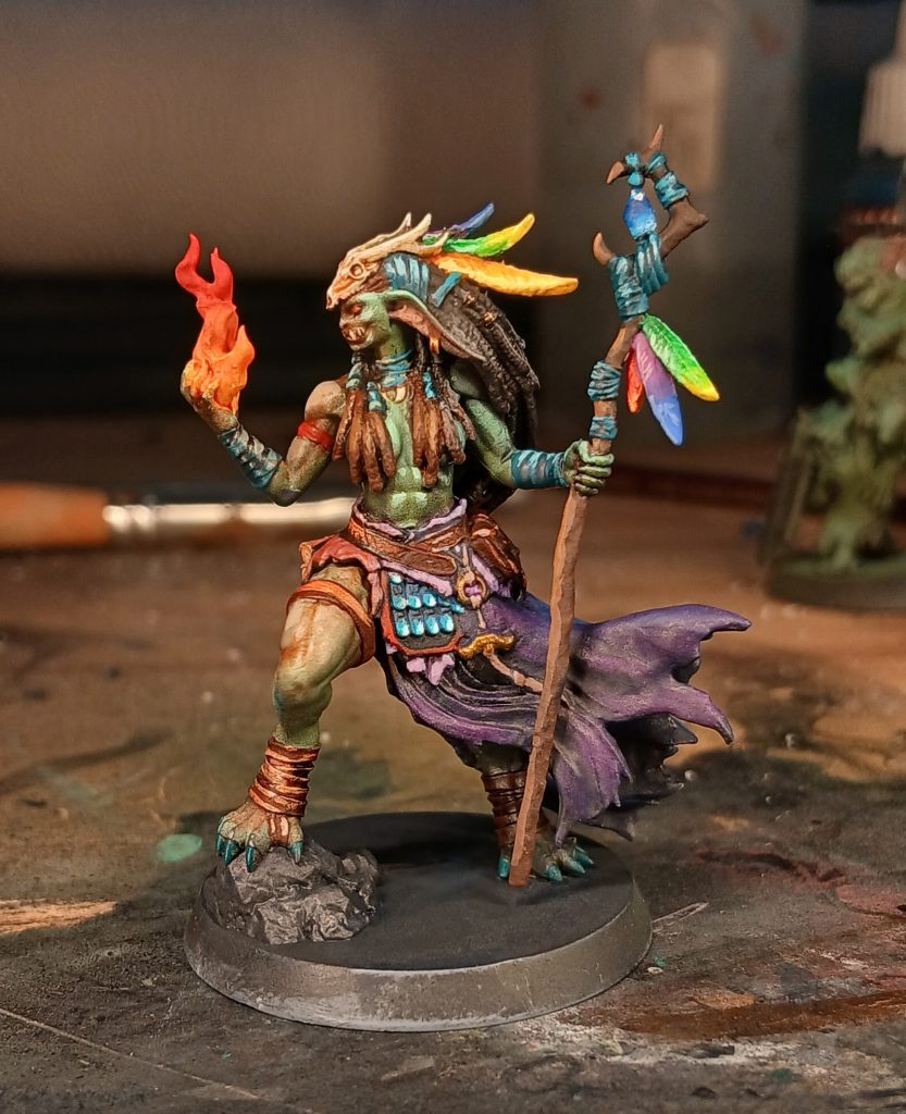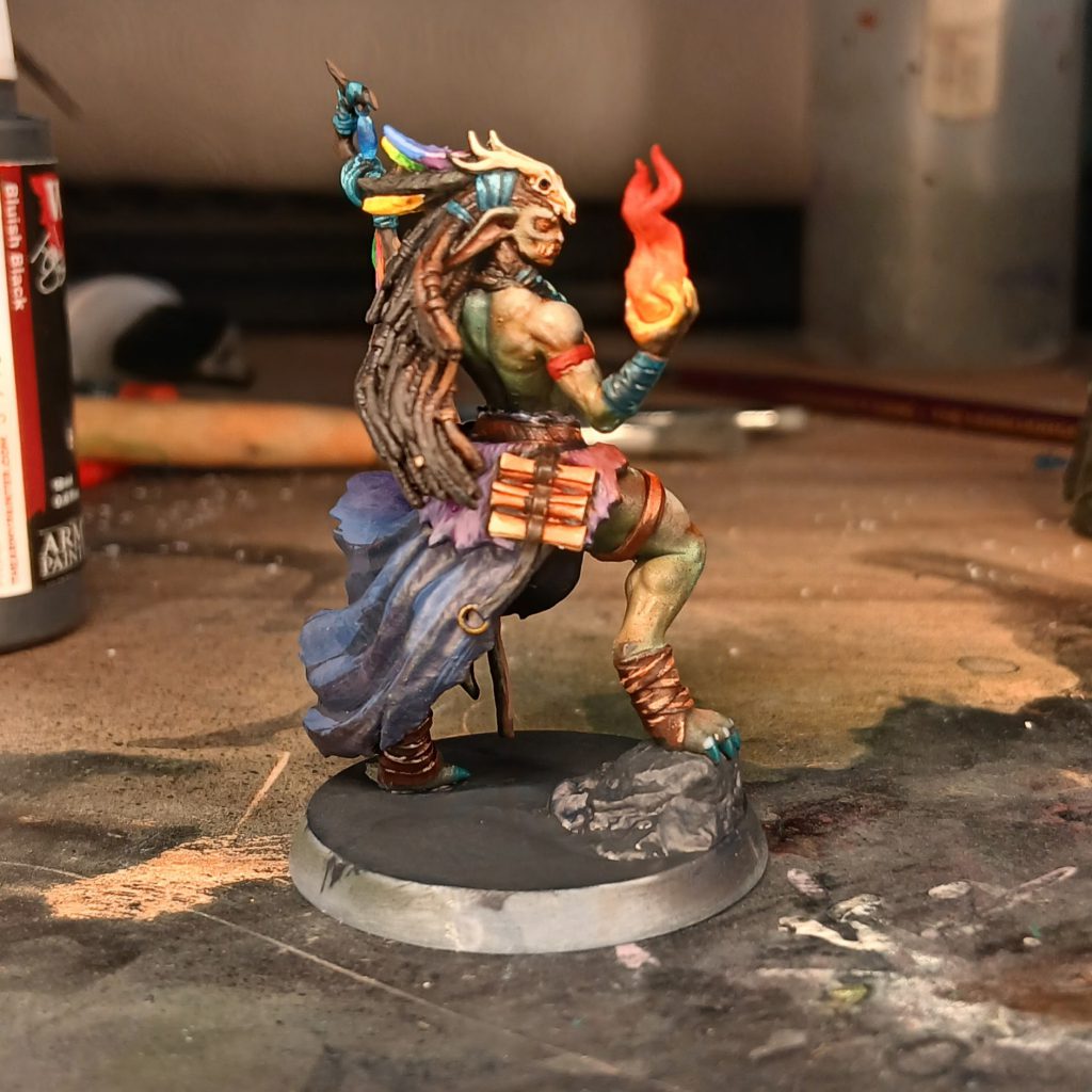The Shamaness is decorated with various feathers, jewels, wrappings and so on. I paint the blue cloth wrappings with Army Painter Fanatic