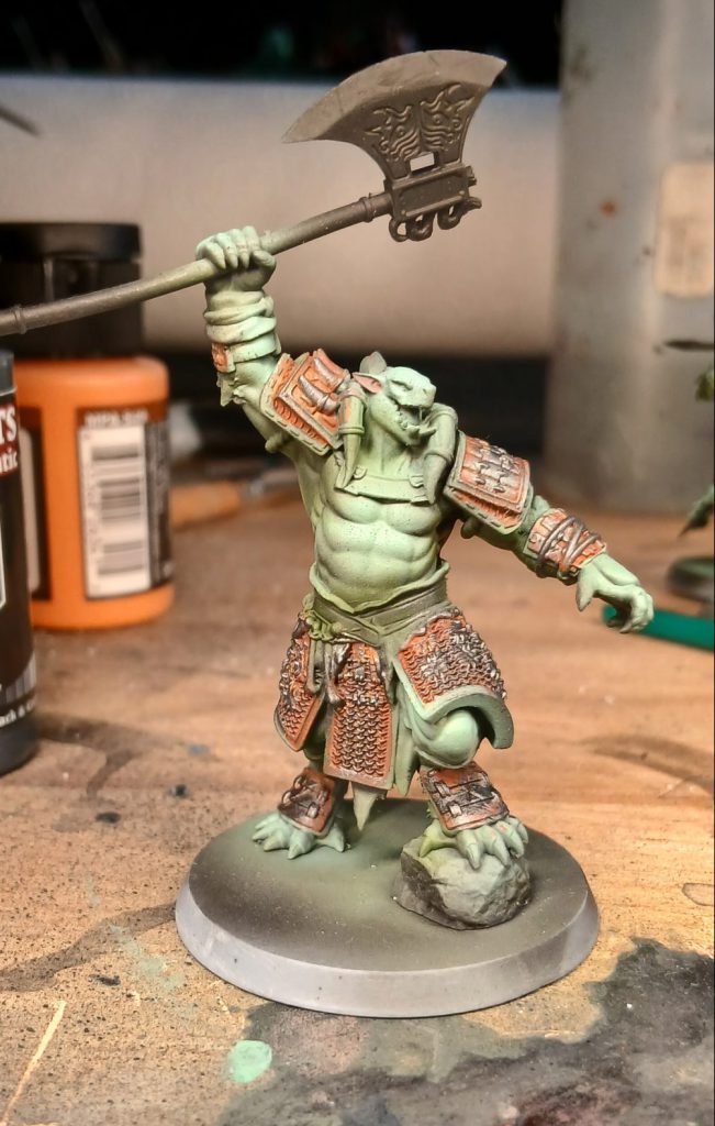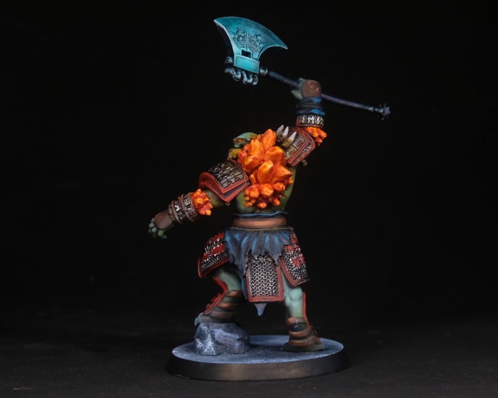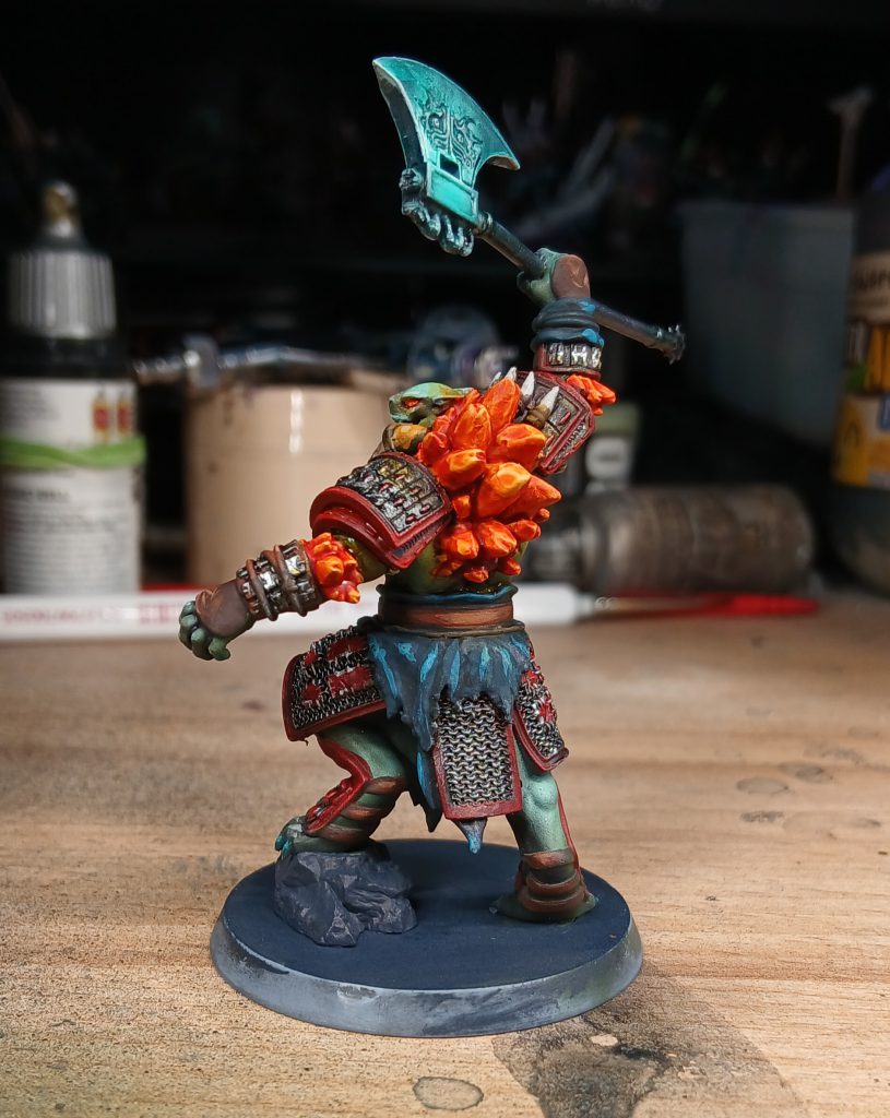His axe is painted with the airbrush, working from a base of Army Painter Air