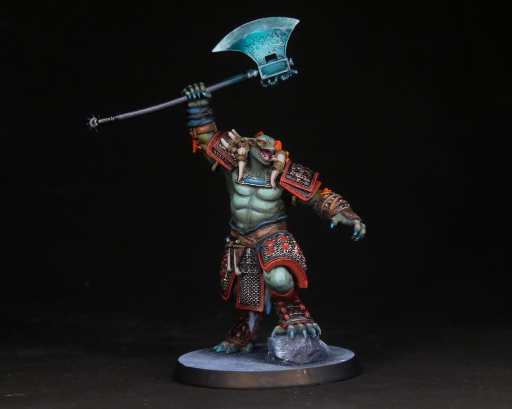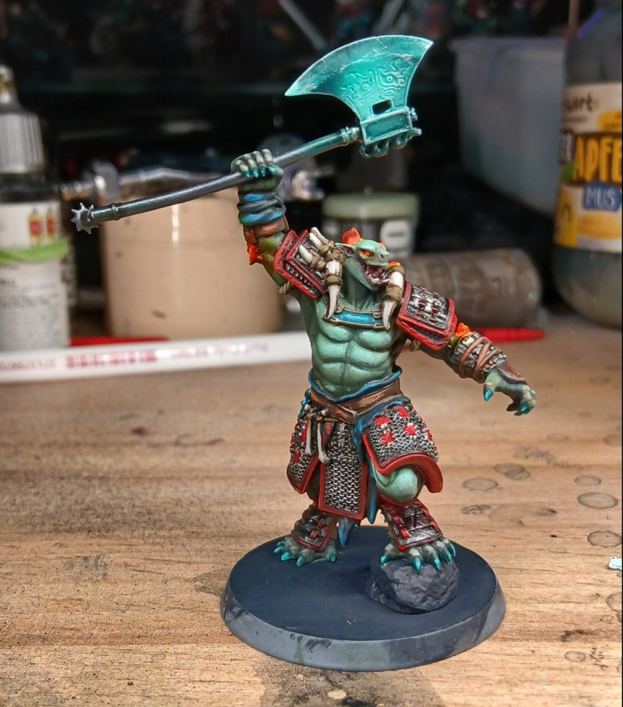 Turnbull Turquoise in a sort of NMM style. With that dry, I run a tiny amount of Turnbull Turquoise into the engraved design of the axe, and edge highlight with some Psychic Shock + White.