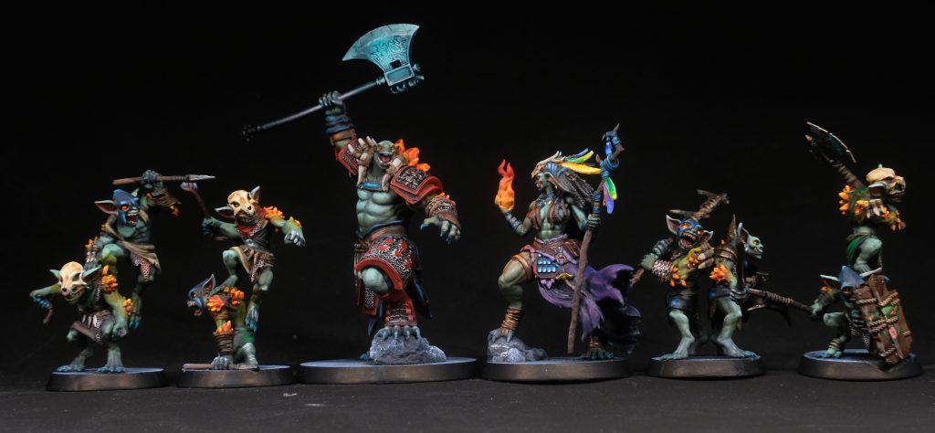 One charming feature of these little goblins (and the large hobgoblin) are the mana crystals erupting from their bodies, you can really paint these any colour you like, but I decided to do something a bit similar to the flame OSL I used on the Shamaness. I basecoated all the crystals (and the glowing eyes) with ProAcryl