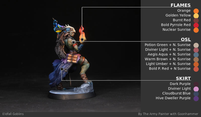The defining feature of the Goblin Shamaness is, to me, the flame she's holding and the opportunity to turn that into some warm object source lighting (OSL for short). The warmth will provide a nice colour contrast to the general coldness of the green skin, which will be more aesthetically pleasing. I basecoat the flames with ProAcryl