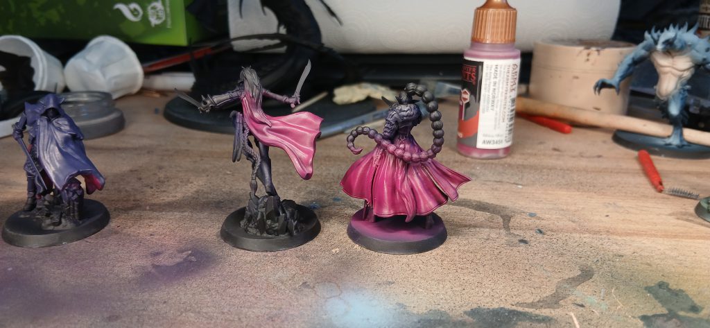 Dark Purple, I spray the burgundy cloth all over with Army Painter Air (hereafter referred to as APA)