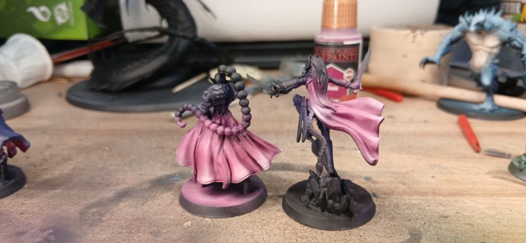 Warlock Purple, focussing on the parts of the cloth that face upwards and avoiding the shaded recesses. Once that's dried, I move on to targeting the highest parts with