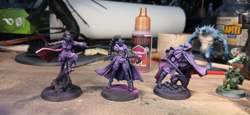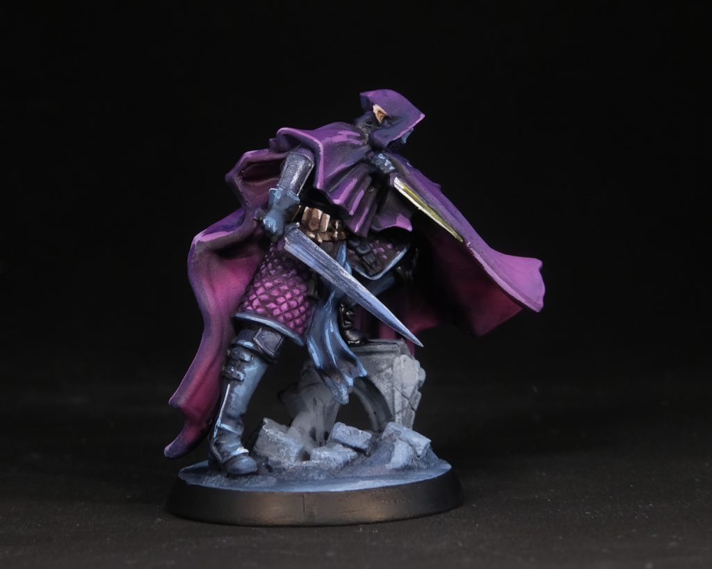 Royal Purple, a really nice warm purple that gives us a bit of colour contrast with the cold Dark Purple. Later I'll decide to paint the leader's coat slightly differently but bear with me for now. Once the Royal Purple has dried, I paint the hem of the Hired Blade's cloak and the very very highest parts of the others with ProAcryl