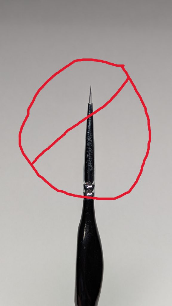 do not want a teeny tiny brush with 3 bristles on it that are 2 cm long. The reason for this is that you do not want the paint drying out in your brush before you go from your palette to your model. If there is nowhere for your brush to store moisture, that is what’s going to happen. Then when you go to dot the eye, nothing is going to happen. Then you’ll try to dot it again…and again…and again…and then the entire contents of the brush will spooge out the end of your brush and gum up your model’s eye socket and you’re going to have a bad time. See the below pic for an example of what you’re looking for, and what you should avoid. Same advice applies for free handing, but that’s a different topic for another day.