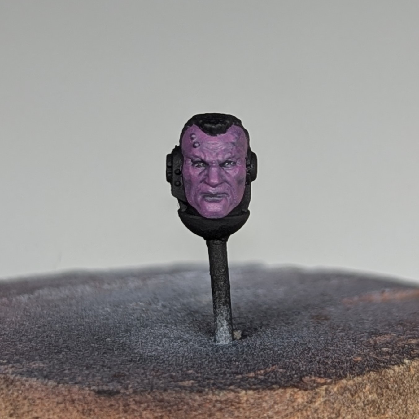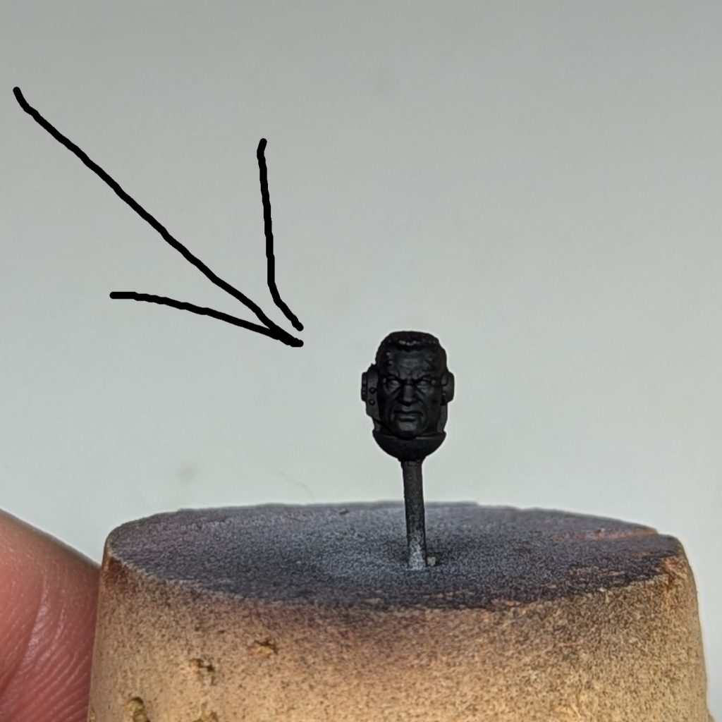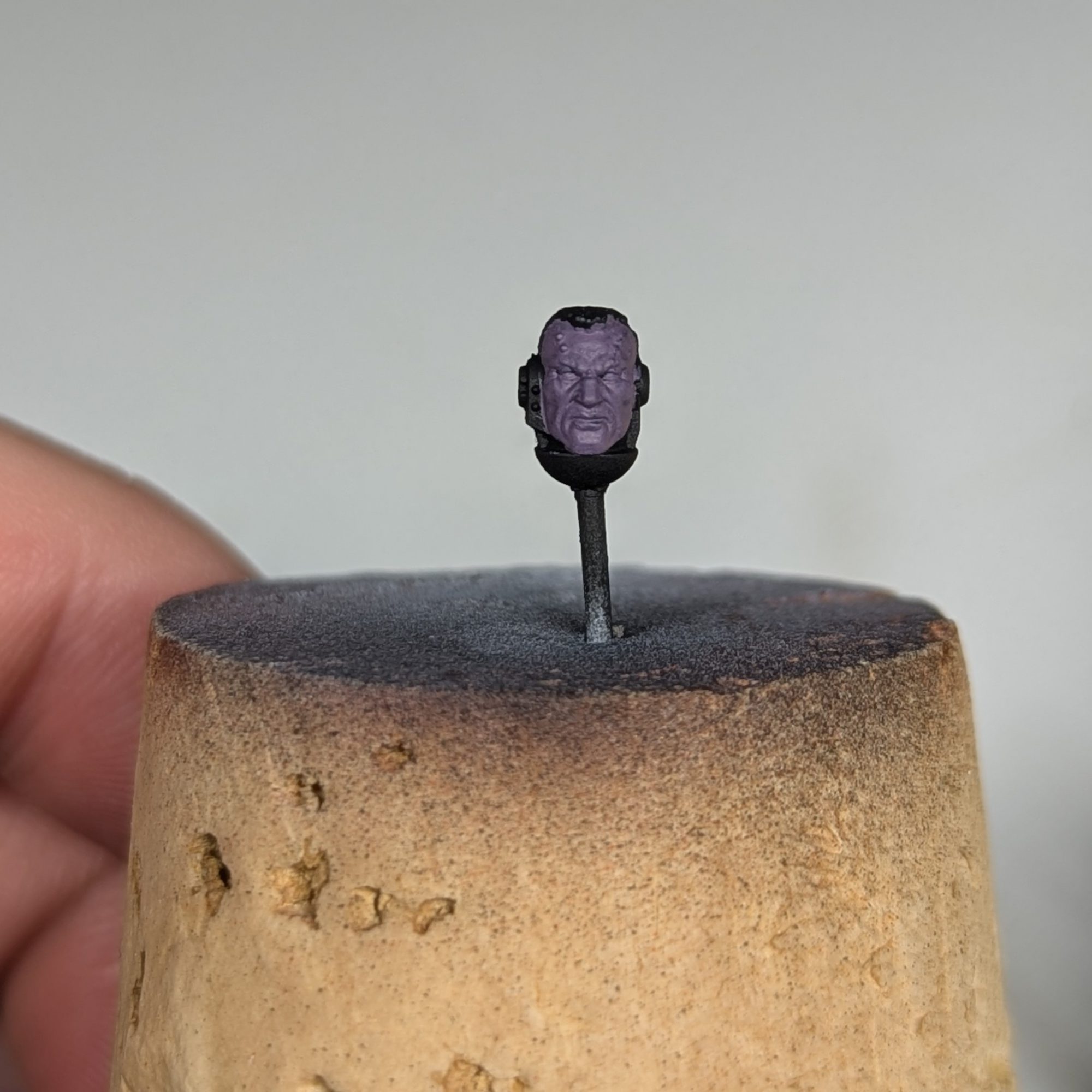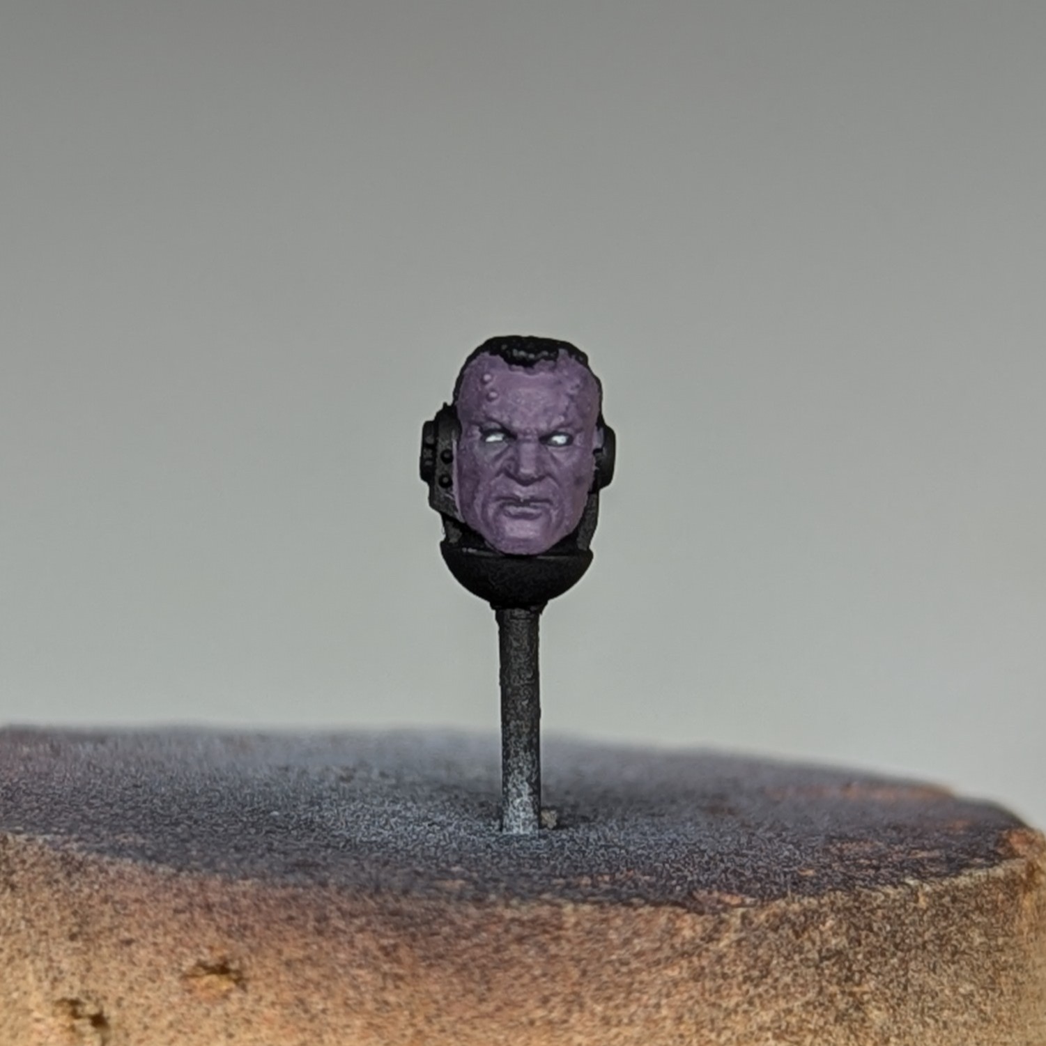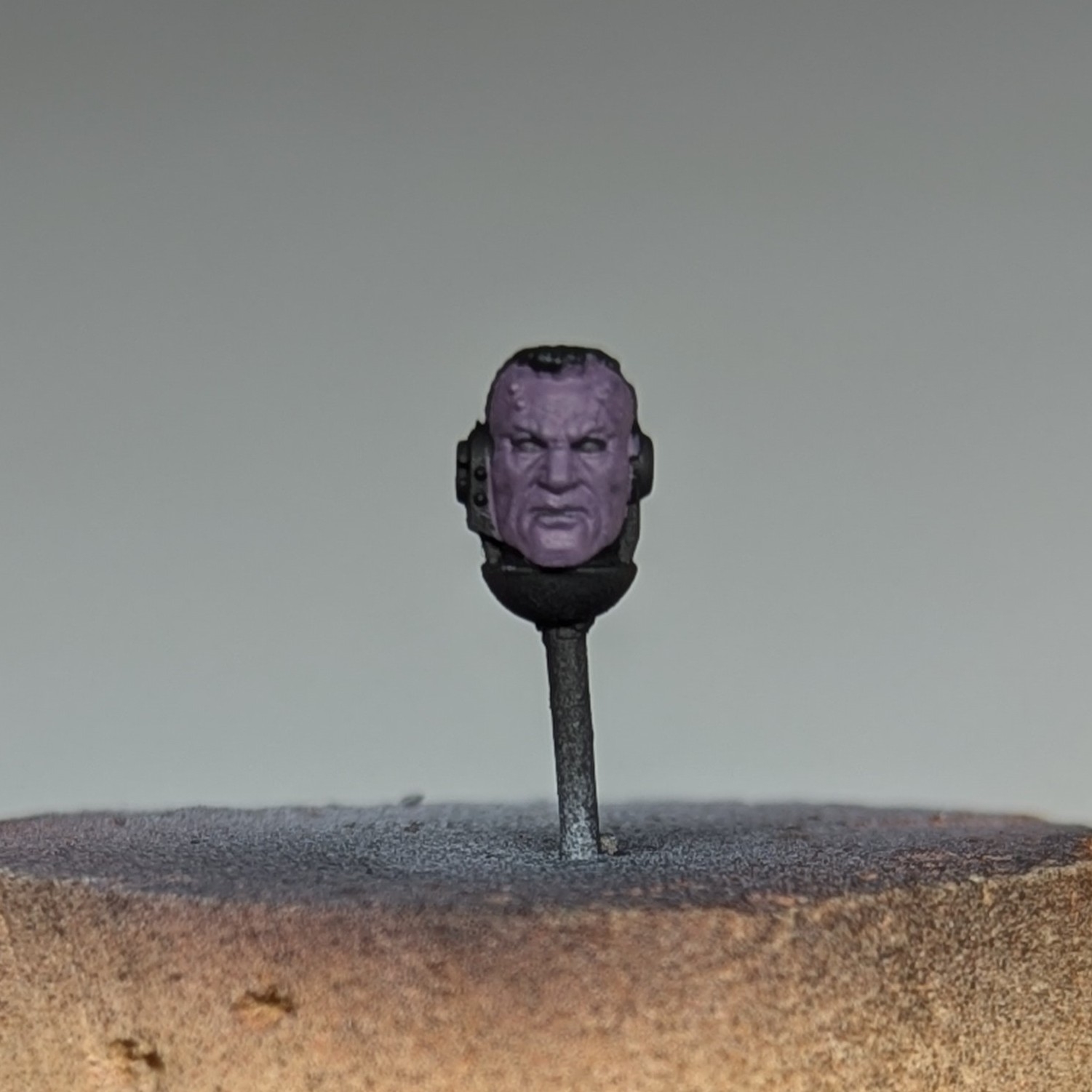 We will be painting a head from the new(ish) Horus Heresy Melee Weapons Upgrade box. I have primed it black. In the first article, I talked about doing a zenithal highlight or pre-shade as a light map (or as a base coat for easy wash or Contrast type paint application.) I encourage you to still try it out, but for this face I skipped that step as I did not feel I needed it. Plus, working with thicker layers of paint like I will be makes it unnecessary pretty quickly.