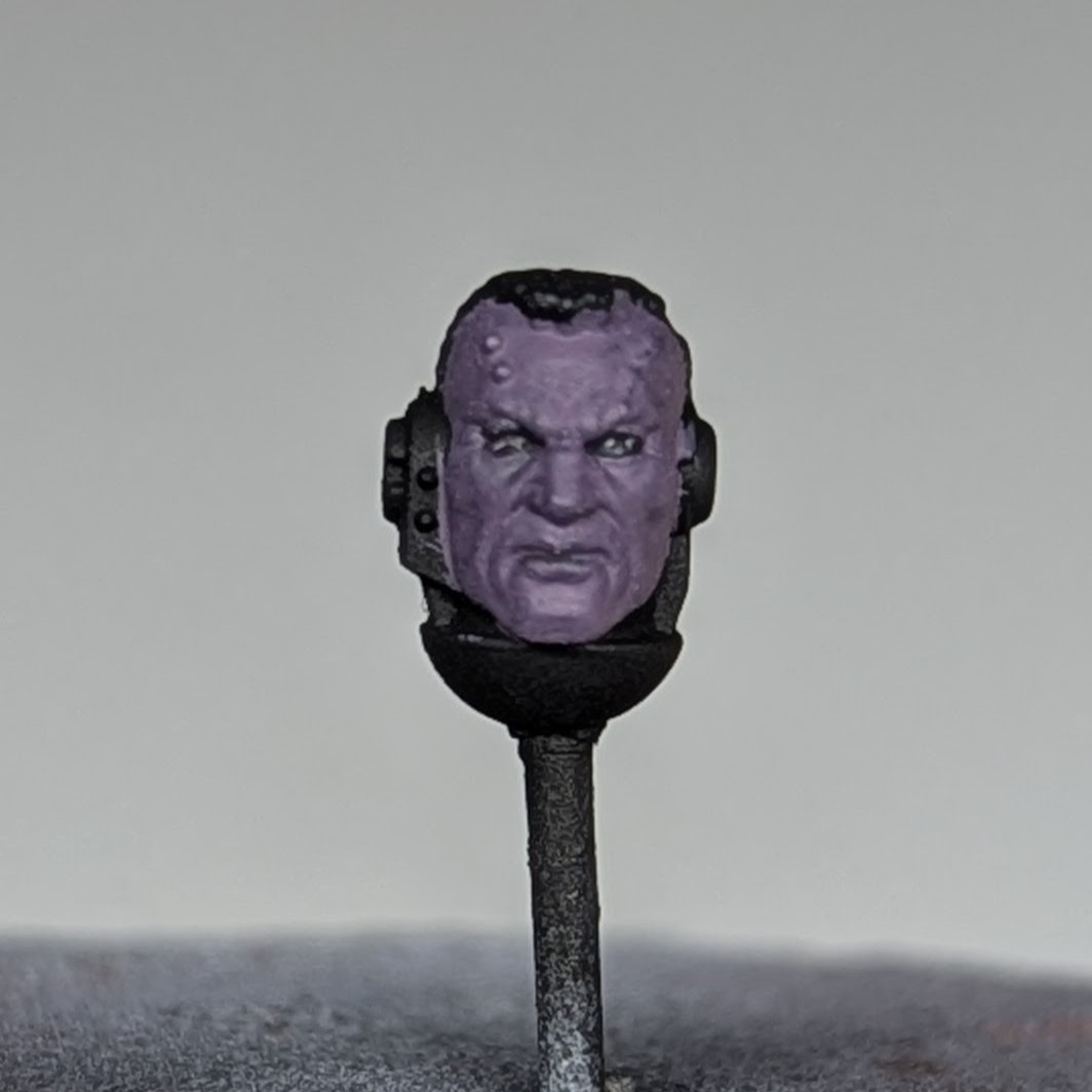 As discussed in the last article, some people can find it helpful to start with painting the eyes. I went ahead and base-coated the face using a mix of the Dark Magenta and Coal Black for this dark purple color.
