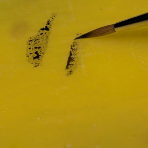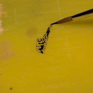 Third is a glaze. A glaze is thinned even more than a layer and is used more for filtering, blending, and smoothing. You are not looking for a solid, opaque layer; glazing is a precision tool. An important note on glazes is when you get it to the consistency you want it (again, testing on your thumbnail), you want to wick the excess off your brush onto a paper towel. You want thin paint, and not a lot of it. If you leave all the moisture in your brush, that is more like a wash that will flood into the recesses of your model, and that’s not what we want here. Aim for your brush to look like mine; the bristles should still come to a point, not be all splayed and swollen with moisture.