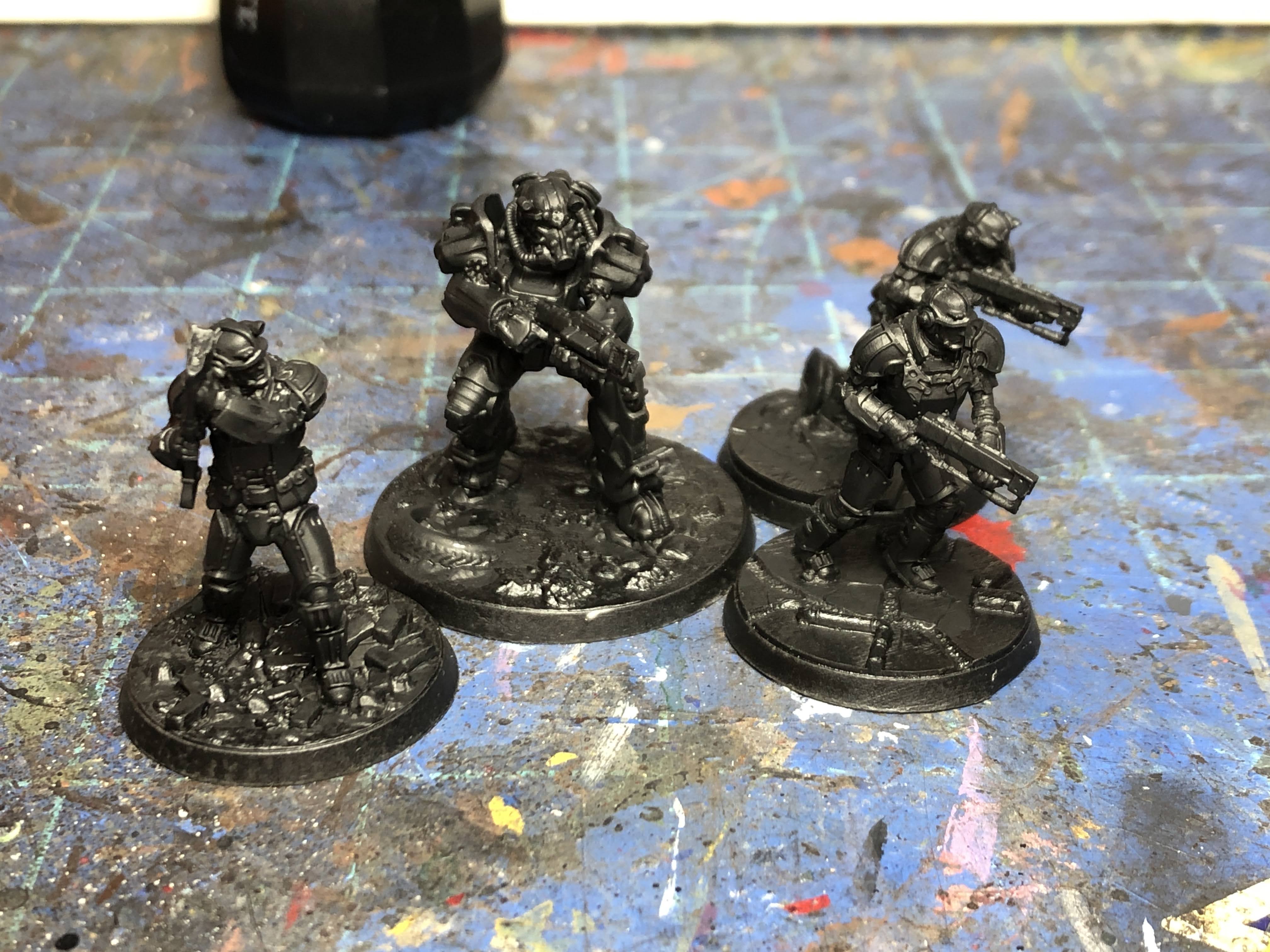 I started with a coat of Krylon flat black spray primer, as the colors are mostly metallics and drabs. I always go over models again with the primer color to ensure I'm working from an even coat, so I used slightly thinned P3 Thamar Black. As it's best to work from the inside out, I started with all the undersuits. I based these on the