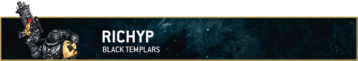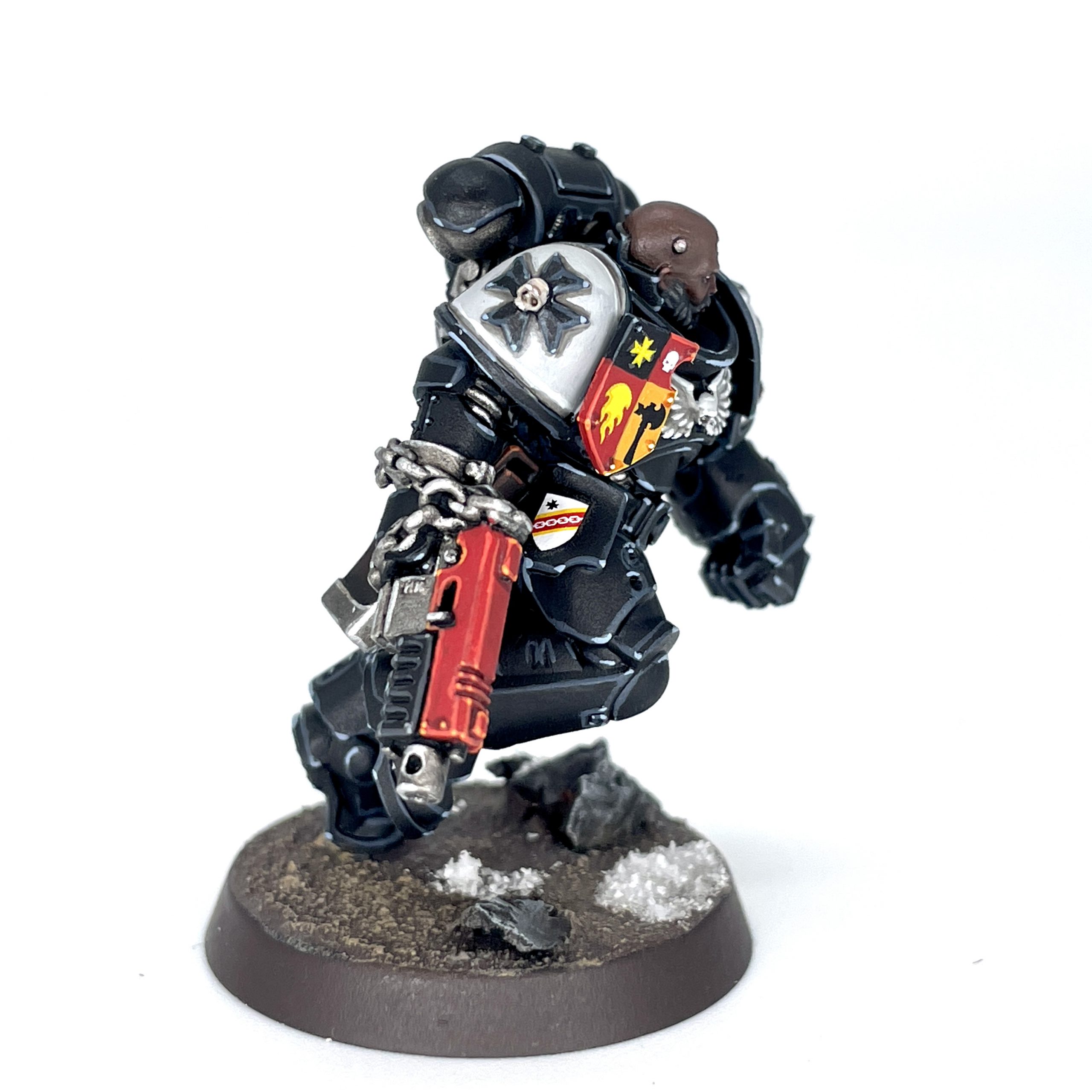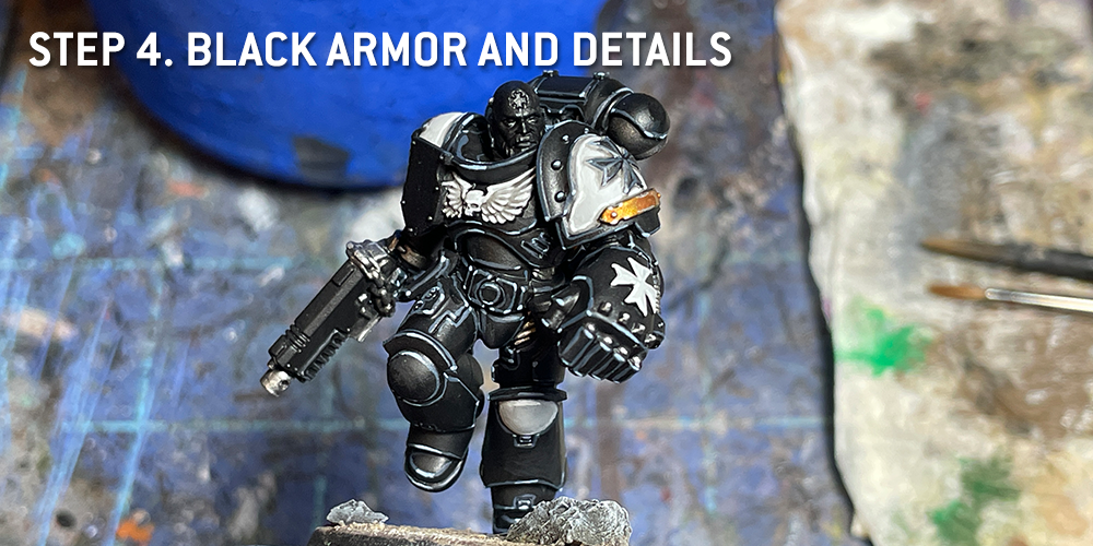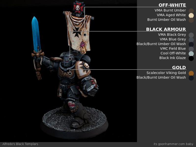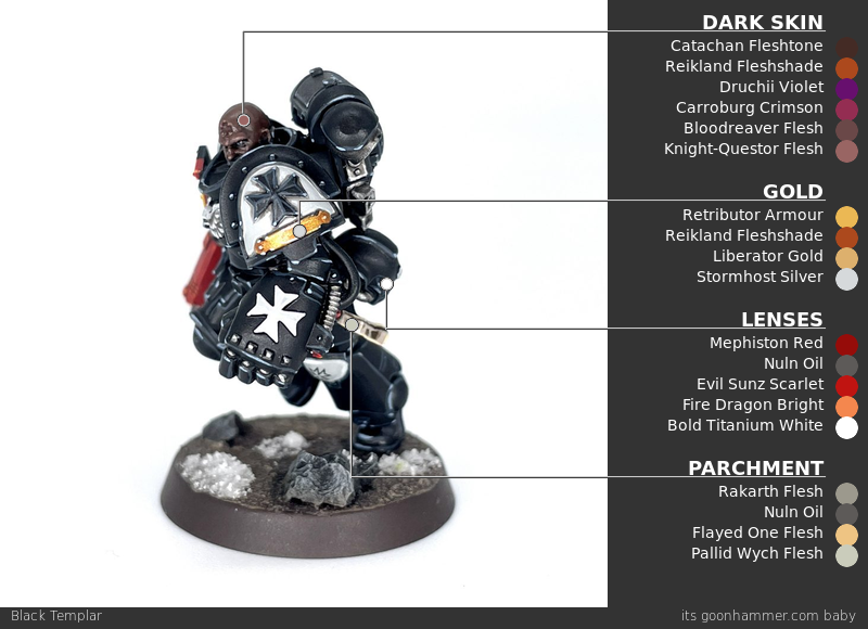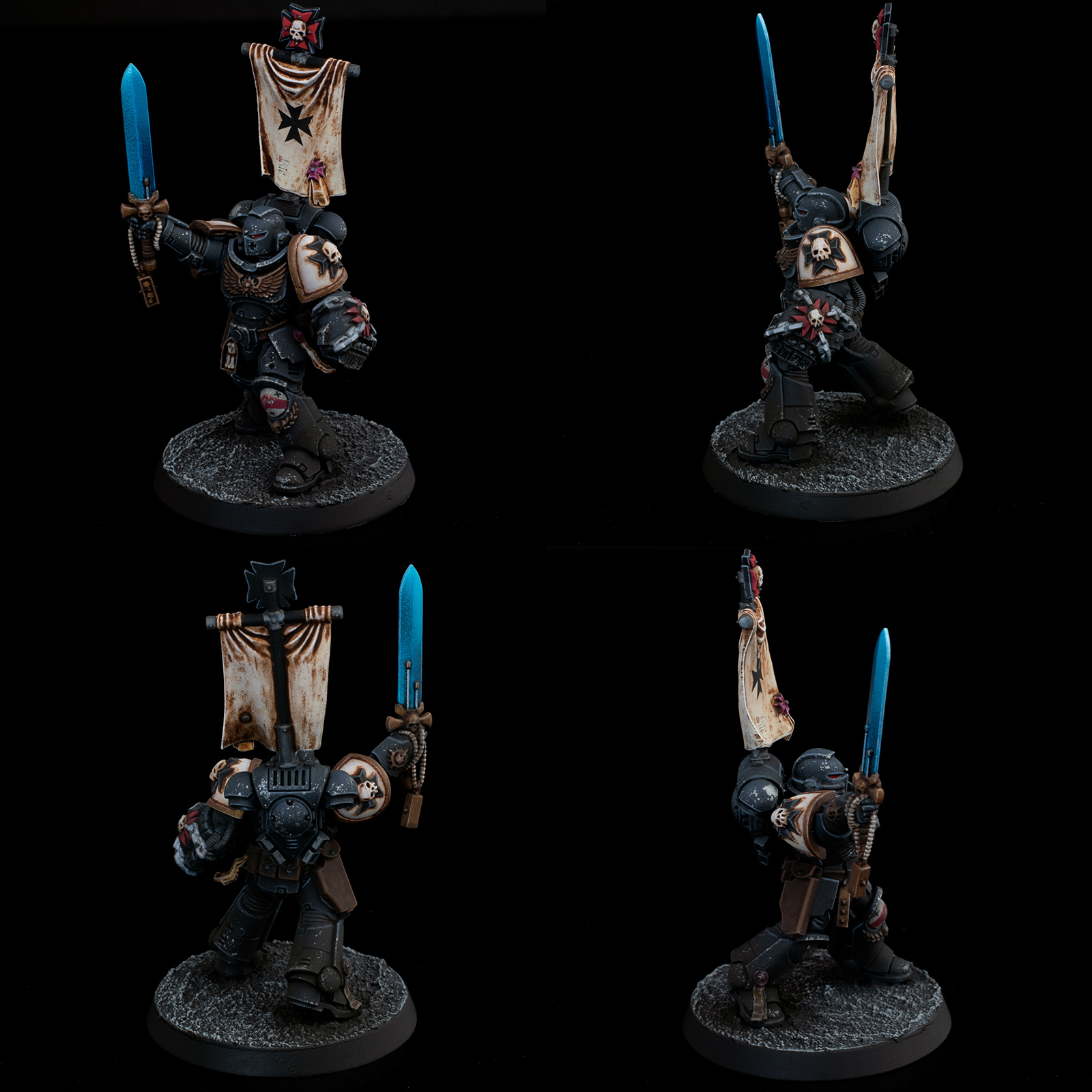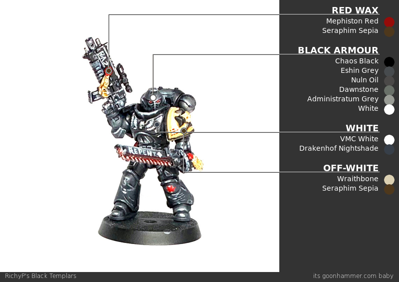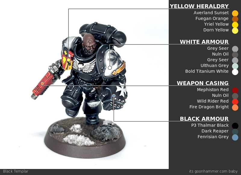 Black Templars can run the risk of looking rather dull, as black and white often lead to some drab highlights and shades. I like to go for a cool black and a neutral white, and save the warm accents for weapons, purity seals, heraldry, and skintones. By having a limited scheme but a number of colors that contrast in hue, saturation, and temperature, our models can look exciting without being clownish. It all comes down to black, white, red, and yellow.