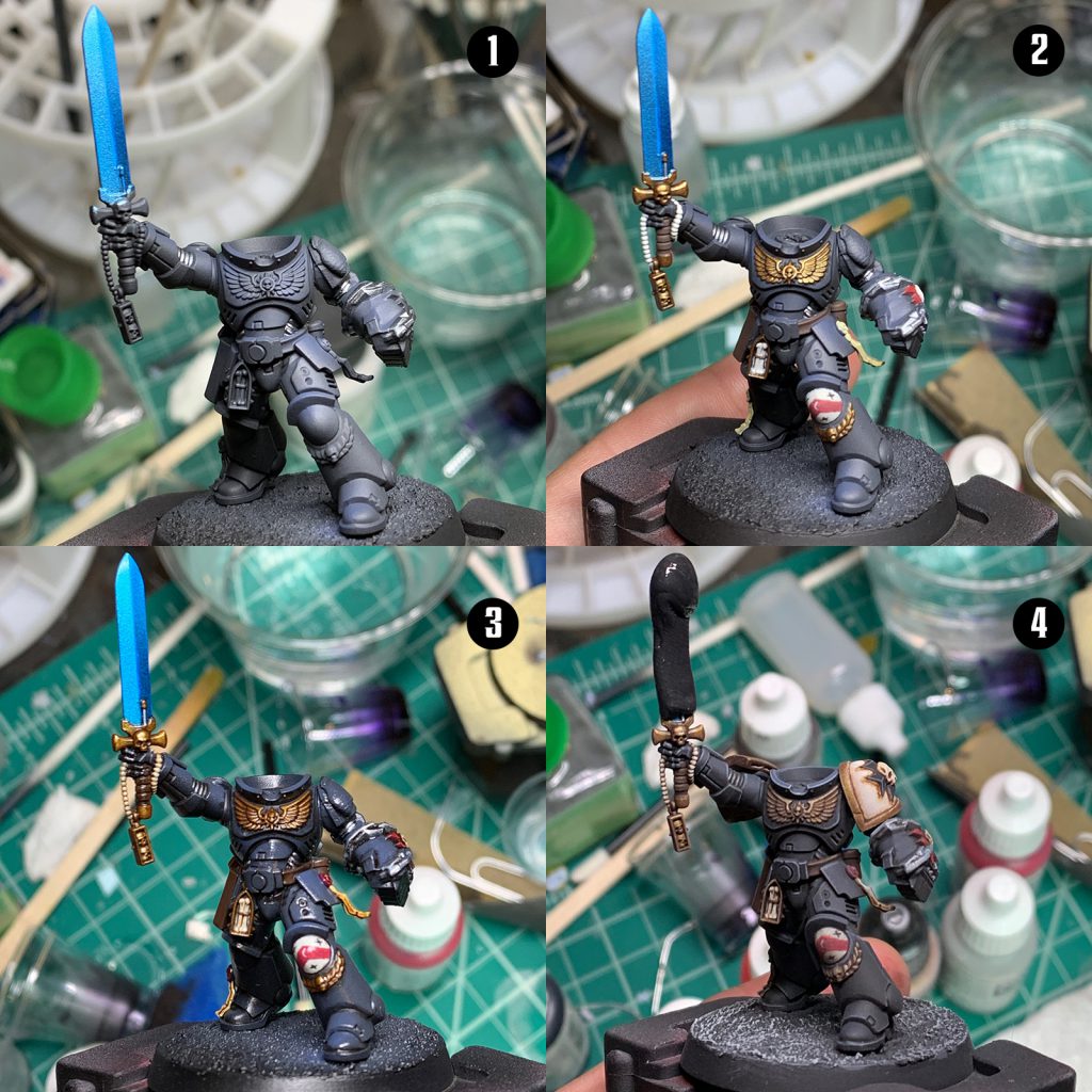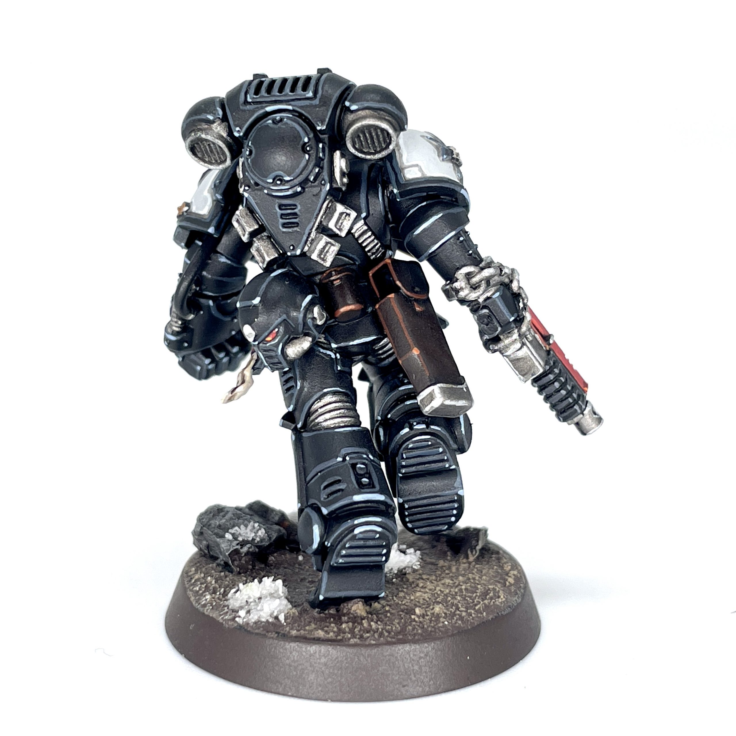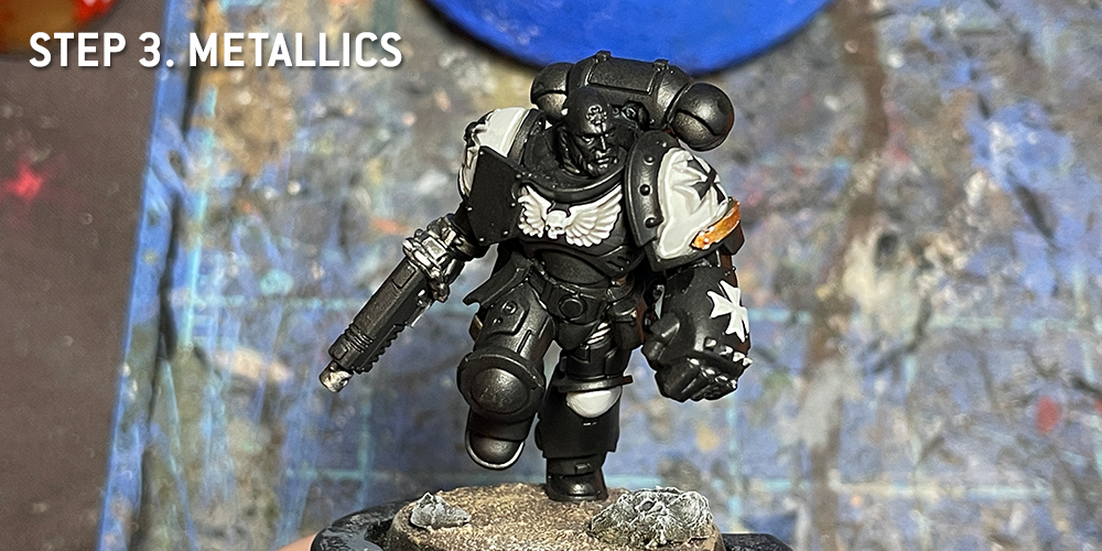 This is the most important and time consuming step, and it's very easy to turn your black into a blue or grey if your highlights are too thick. As always, cleaning up with your base color after the fact is key. We highlight each and every edge with Dark Reaper, then hit the sharpest edges with Fenrisian Grey. I also do this around the inside edge of the shoulder pads if I'm painting those black. These highlights both give the armor a cool tone that contrasts nicely with the brighter, warmer colors we'll use on weapons on heraldry. There are also a few details on weapons I like to paint in a slightly different black, namely the handles and foregrips. These work from the same Thamar Black base, highlighted with Eshin Grey and then Dawnstone on the sharpest edges and rivets.