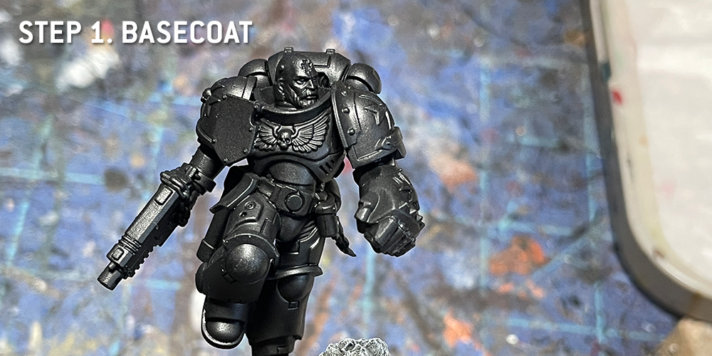 P3 Thamar Black, just to ensure that I have an even base color and to cover any areas I missed. It's a common mistake to just let your primer be your base color, but if you go back to clean up a mistake, the colors won't quite match unless you do this step.