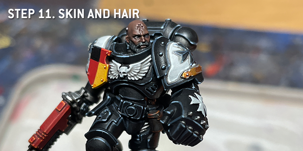I like painting bare heads on models; it's a nice treat after all the metallics and sharp edge highlights on your typical Marine. The key here is smooth volumetric highlights, with a little bit of edge highlighting on the nose, ears, and brow. I also use some purple and red washes around the eyes, nose, and mouth to give some extra color variation and a smidge of realism. The model pictured is using my dark skin and black hair techniques, but I also wrote my light skin recipe here too. Basically pick any three sequential skintones in GW's range and you're good to go.
