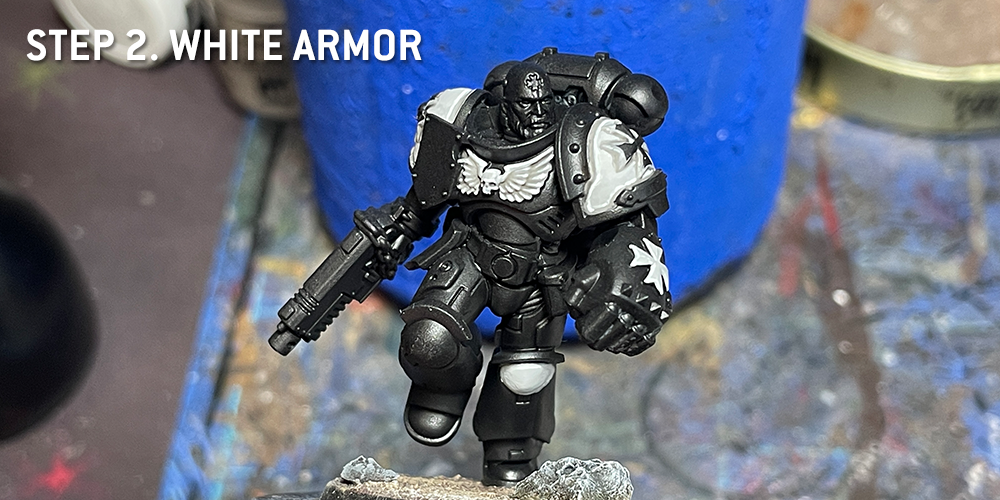 We're going to do the white armor first, just to get a good grip on how the colors are spaced out on the miniature. I start with