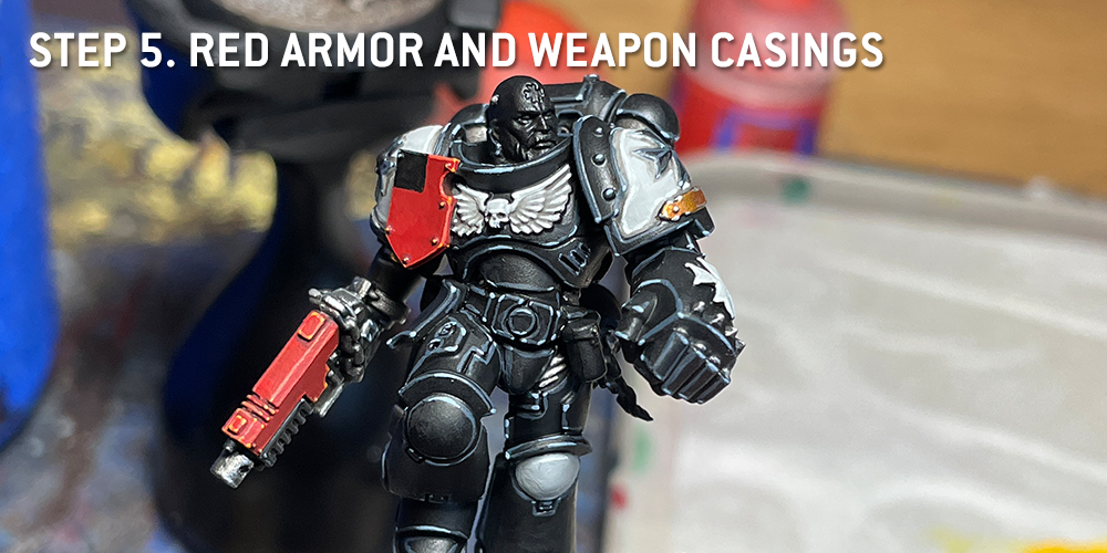 I like to go for a bright, warm red here, highlighting up to an orange. While this is how I like to do weapon casings on the majority of my Templars, it's also great for heraldry and the red trim and crosses on your close support and veteran Templars.