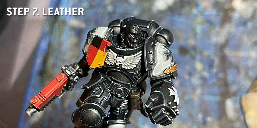 Straps, holsters, and handles of weapons will often be leather, and I like a warm dark brown. I paint them Rhinox Hide, wash em with Agrax Earthshade, and apply a pair of highlights, same as just about anything else.