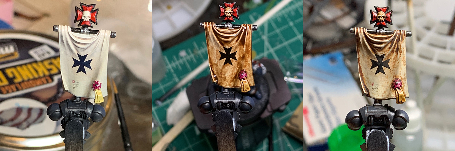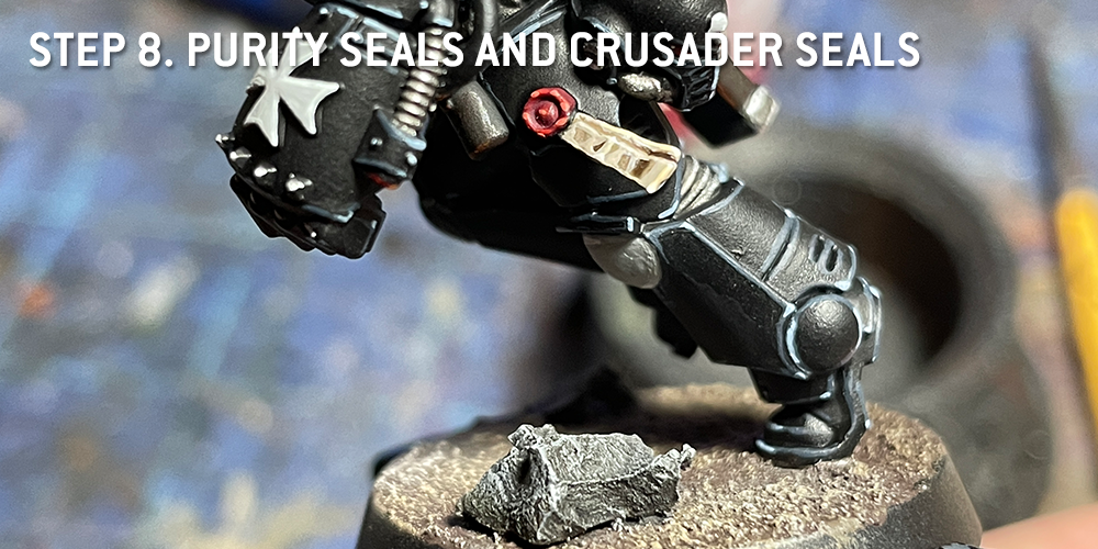 You will invariably have a few of these Good Boi Awards on your Marines, and I like to paint them a different shade of red to keep them distinct from other red details. The scroll technique also will work on any scrollwork that might be on their armor. They also may have crusader seals, which look like purity seals but with a little shield or Templar cross made of metal instead of wax. These are going to be in a dark red; the same dark red I would use to paint red capes. The metal part of them will follow the Steel technique in Step 2.