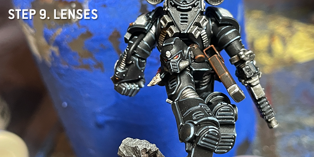I’ll outline two techniques here - one for general red lenses, and one for green lenses whenever you have a lens appearing up against something red, such as a Techmarine's helmet. These will both usually be on eyes, but also any targeters, monocles, or what have you. I paint the eye the base color, then paint progressively brighter half moons towards the inside edge of the eye, then dot the outside, darker edge with a pure white.