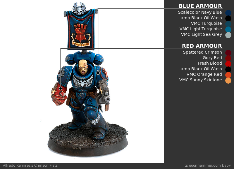 Crimson Fists are pretty non-compliant when it comes to heraldry. The most striking aspect of their color scheme is of course the eponymous left red fist that all Crimson Fists bear. Veterancy is indicated by a right red fist as well. Strictly speaking this is for 1st Company Veterans, but many people like to use it to indicate any kind of senior model, such as a Sergeant. Perhaps because of their decimation, Crimson Fists don't use company markings, leaving their shoulder trim blue. They do use typical squad markings (gothic script) and battlefield role markings.