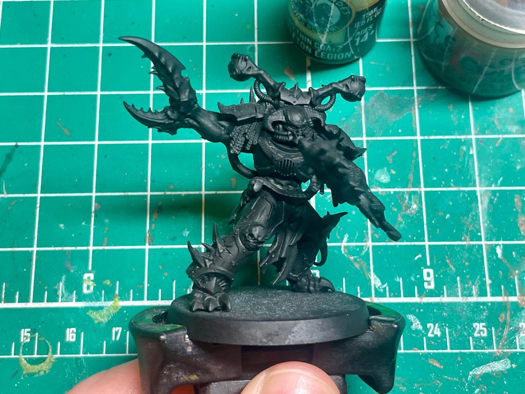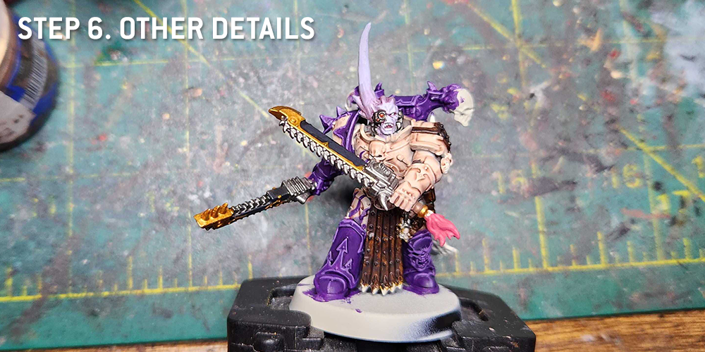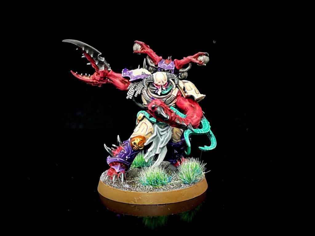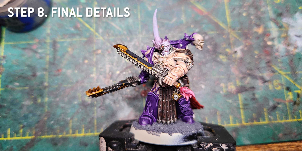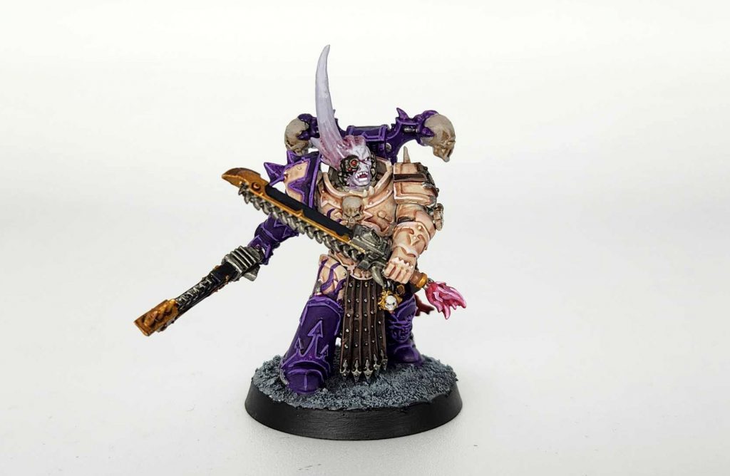 The most notable part here is the head; I used a Slaanesh champion head from the old CSM sprue for this guy. The head here is painted Slaanesh Grey and washed with Carroburg Crimson, then highlighted again with Slaanesh Grey and a mix of Slaanesh Grey and Reaper Pure White.