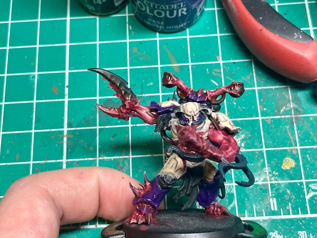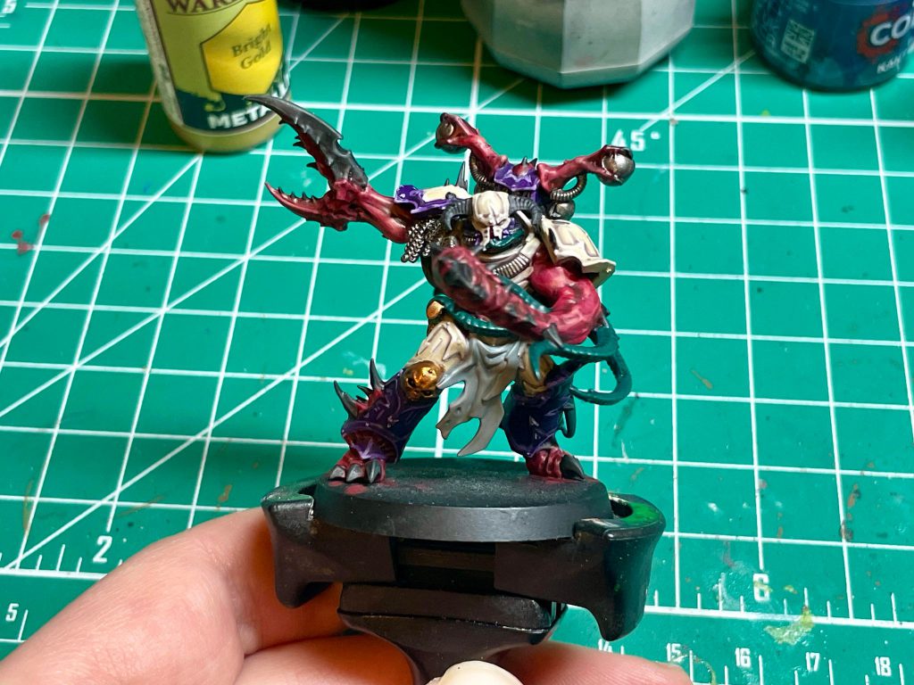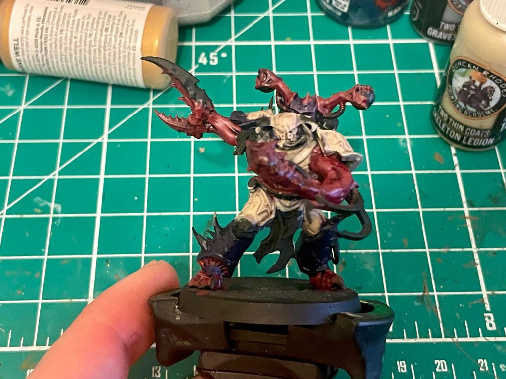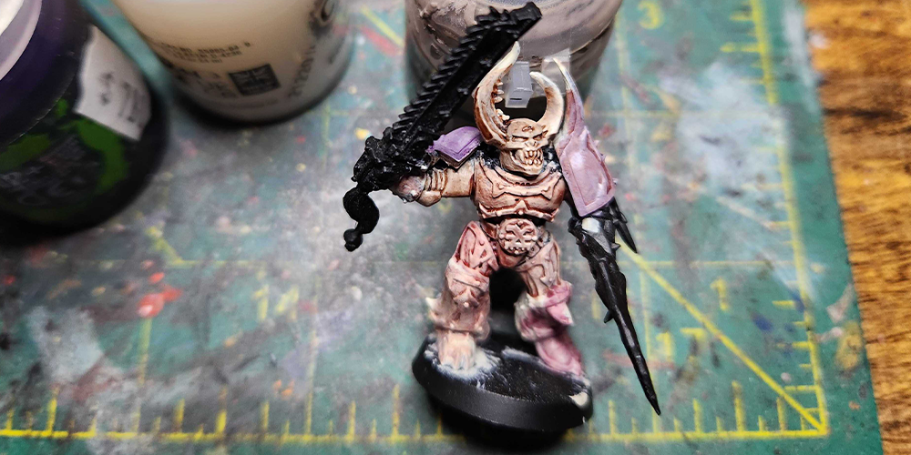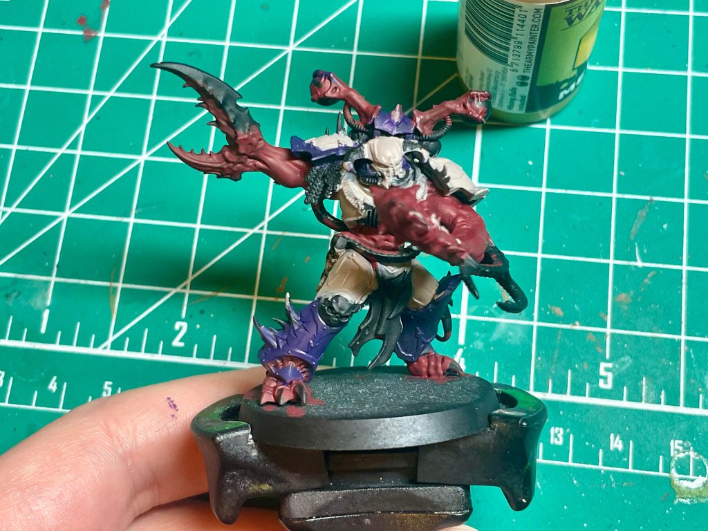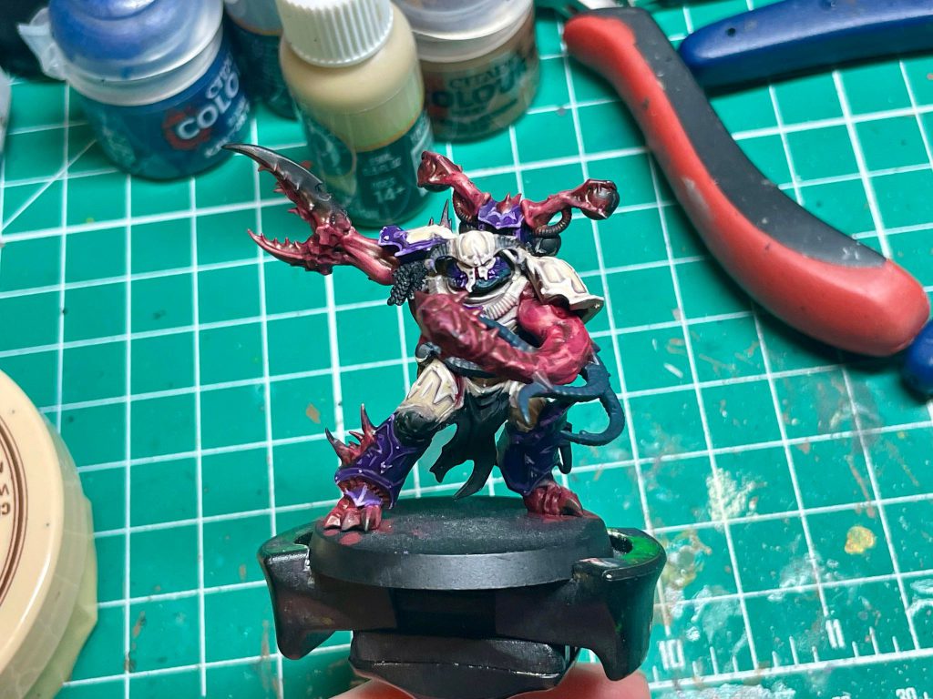 ">Warpsong Games for his tutorial on the Flawless Host, which I used as a jumping off point for my color tests before settling on a very similar mix. I also added a bit of Contrast Medium during the process to thin it out. You can see it up there on the model's chest primarily. I recommend doing this yourself and playing with the ratios as you go to adjust your shades.