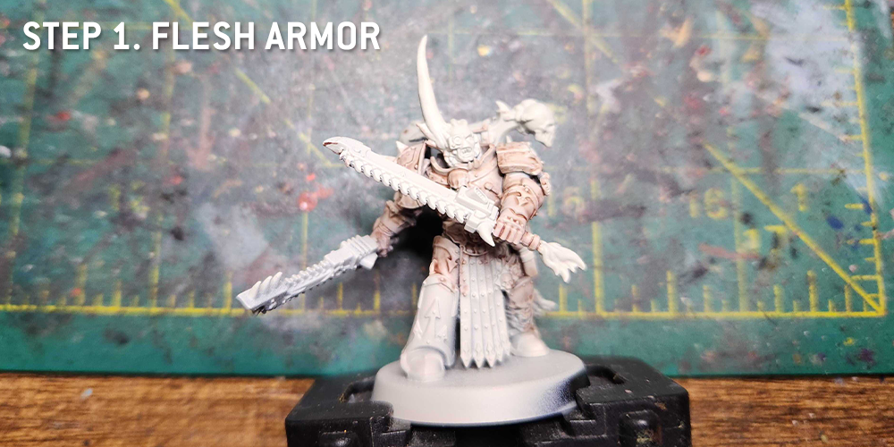 The most difficult (and important) part of painting the Flawless Host is getting the flesh tone on the armor right. I ended up testing a ton of different colors for this, using my test model of an old Possessed model.