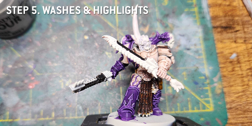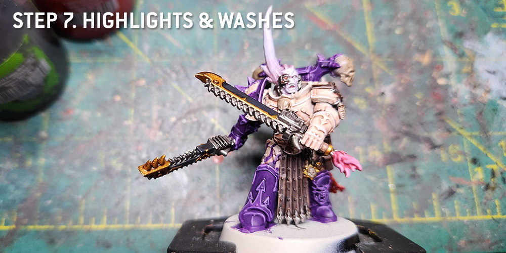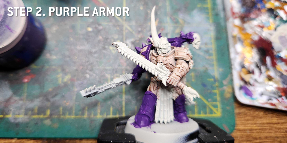 Now it's time to paint that purple armor and do some edge highlights. I wash the crap out of the purple with
