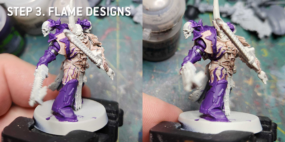 The transitions from purple to flesh can be daunting at first, but they're pretty simple - just take your time and avoid overdoing it. Painting these flames is a two-step process; start by painting the wavy lines that will loosely be the flames, then go back and flesh them out by adding width. Again, all Xereus Purple.