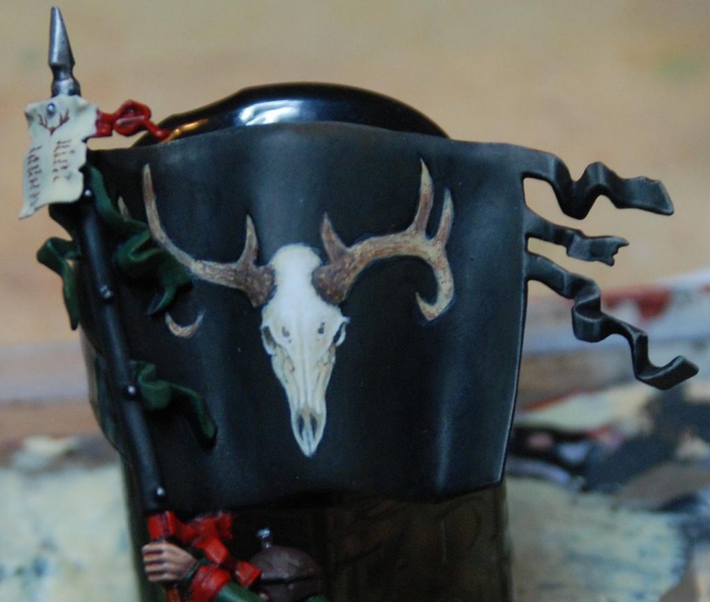 By way of example, let’s go through a step-by-step of an Empire banner I painted way back in 2012. Having chosen a deer skull for this regiment, the Blades of Taal (the Old World god of the wilds, see?) I went looking for reference. I had an idea in my head of what a deer skull would look like, but there were so many details I had no idea about. I can’t find the original source for this image, so apologies to the owner, but have a look: