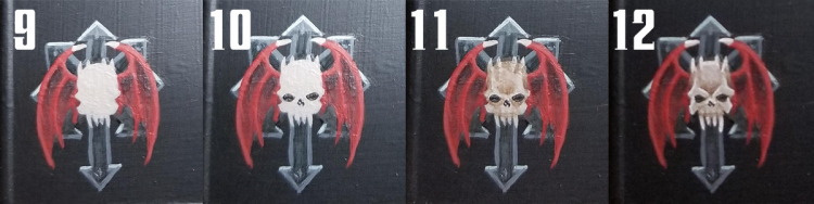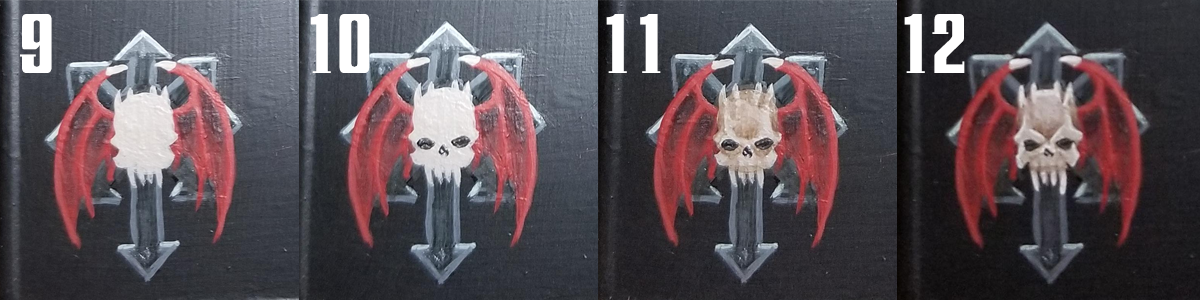 Two changes have occurred in the image above. The first and simplest thing is a bone glaze over the antlers to flatten it a bit and pull the tint closer to the skull. Secondly, white has been used to highlight the skull. I've tried to keep the light fairly flat to keep it looking like an icon, albeit a very detailed one. The way I decide where to highlight is, essentially, to imagine where I'd put the highlights if it were a miniature and then... do that. This means broad, thin layers on smoother shapes like the cranium, and sharper accents on the eye sockets and nostrils. If you're not sure where to put your lighter tones, go back to the reference and look at where the shadows fall.