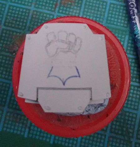 literally a triangle, so the three dots in the image above serve to locate the design and show me how much space it'll occupy. Note that I've put it off the horizontal centre line. This is to try and keep the skull itself as central as possible while still leaving room for the darker antlers.