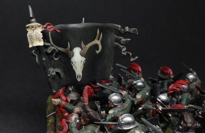 With the design itself done, the banner got a dirt/dust mix sloshed over it. Here it is sitting in its regiment, the Blades of Taal. The ambitiousness of the banner is intended to distract attention from the incredibly lazy paint jobs on the state troops themselves. Clearly, Hochland's finest aren't big on laundry day.