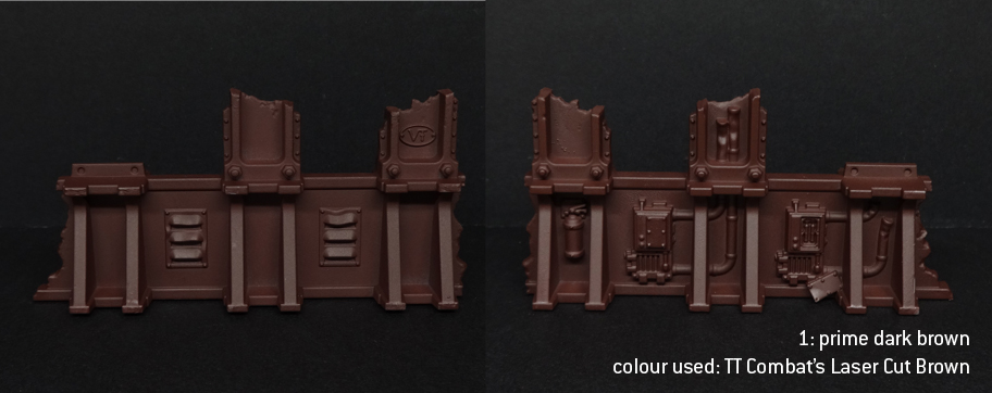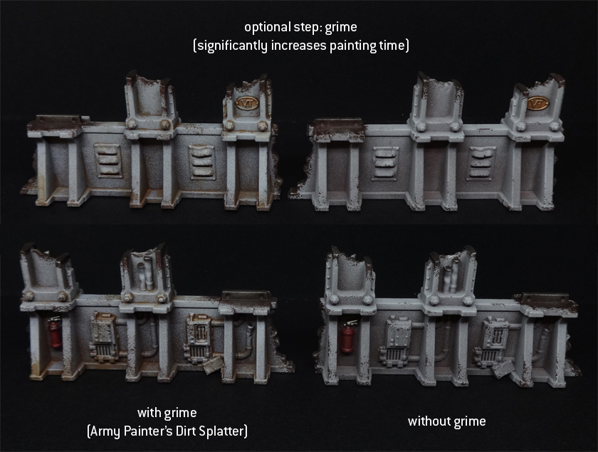This method is easily adapted to different colour schemes, since the basic principle is quite transferrable: prime with a dark brown, zenithal spray with your main colour, and do some very quick detailing. It's blisteringly fast... or at least it was, until I decided to add a grime stage that takes me ages, but which I think really lifts it. I haven't yet had time to try this same method with alternate colours, but I've still got two more Fronteris buildings on sprue so I guess I'll report back later.