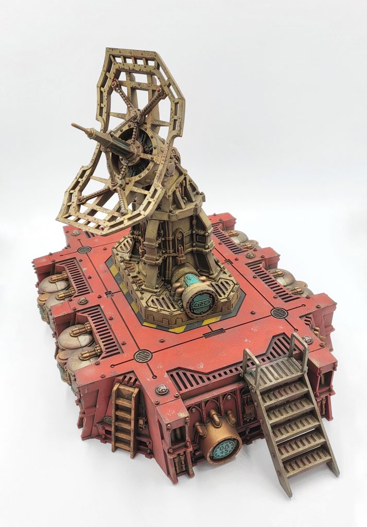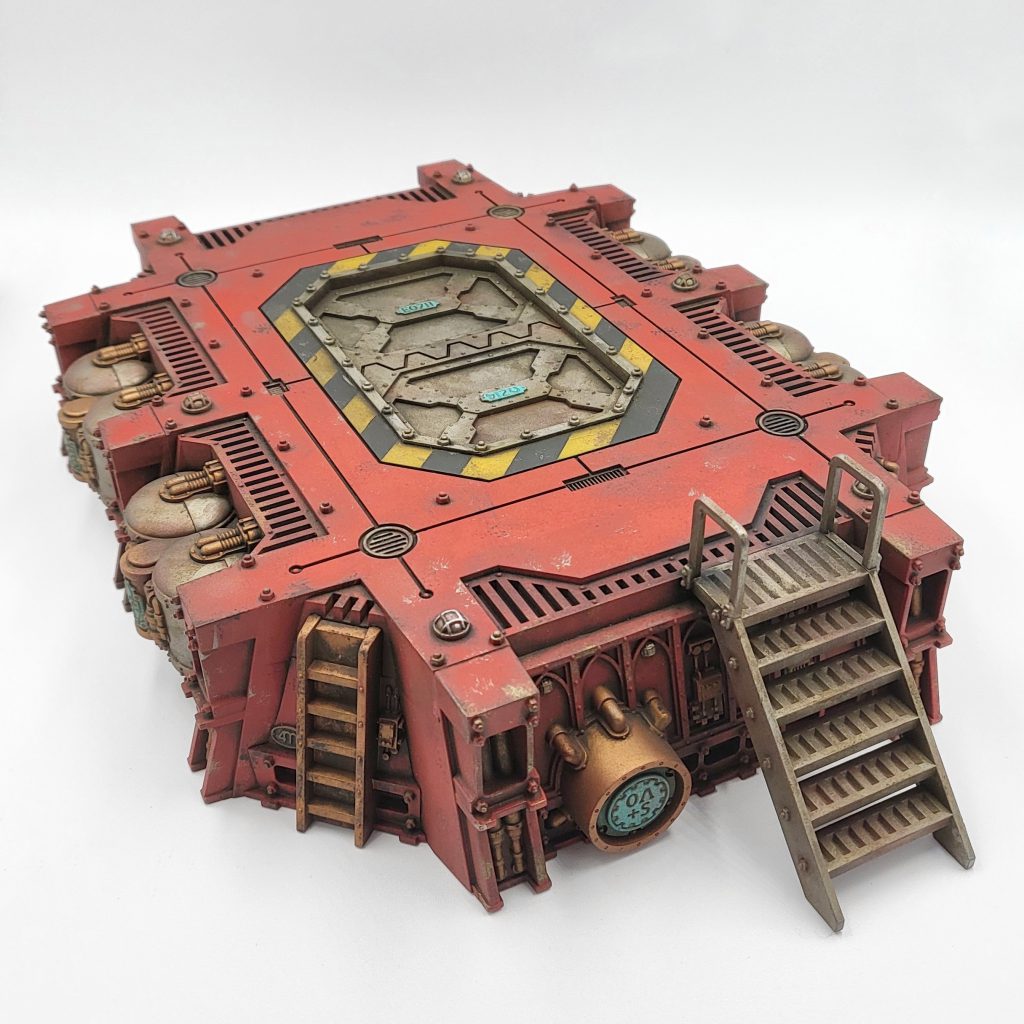 mostly right! I wanted to knock this piece out quick to get it down to the Goonhammer Open, so I made some adjustments to paint this up even faster. The main event here is red. I primed the landing pad with a red-brown rattlecan and basecoated with Badger Scorching Red. You could use Mephiston Red spray to achieve a very similar effect (though I would recommend a lighter brown primer with that can). The Vox Antenna was primed with a bone color, Wraithbone would do the trick. The landing pad was heavily drybrushed with Evil Sunz Scarlet. Silver details got Army Painter Gunmetal and gold stuff was painted with AP True Copper (GW Balthasar Gold is a match here). Some sign and detail bits were painted with Golden High Flow Acrylic Teal (my favorite).