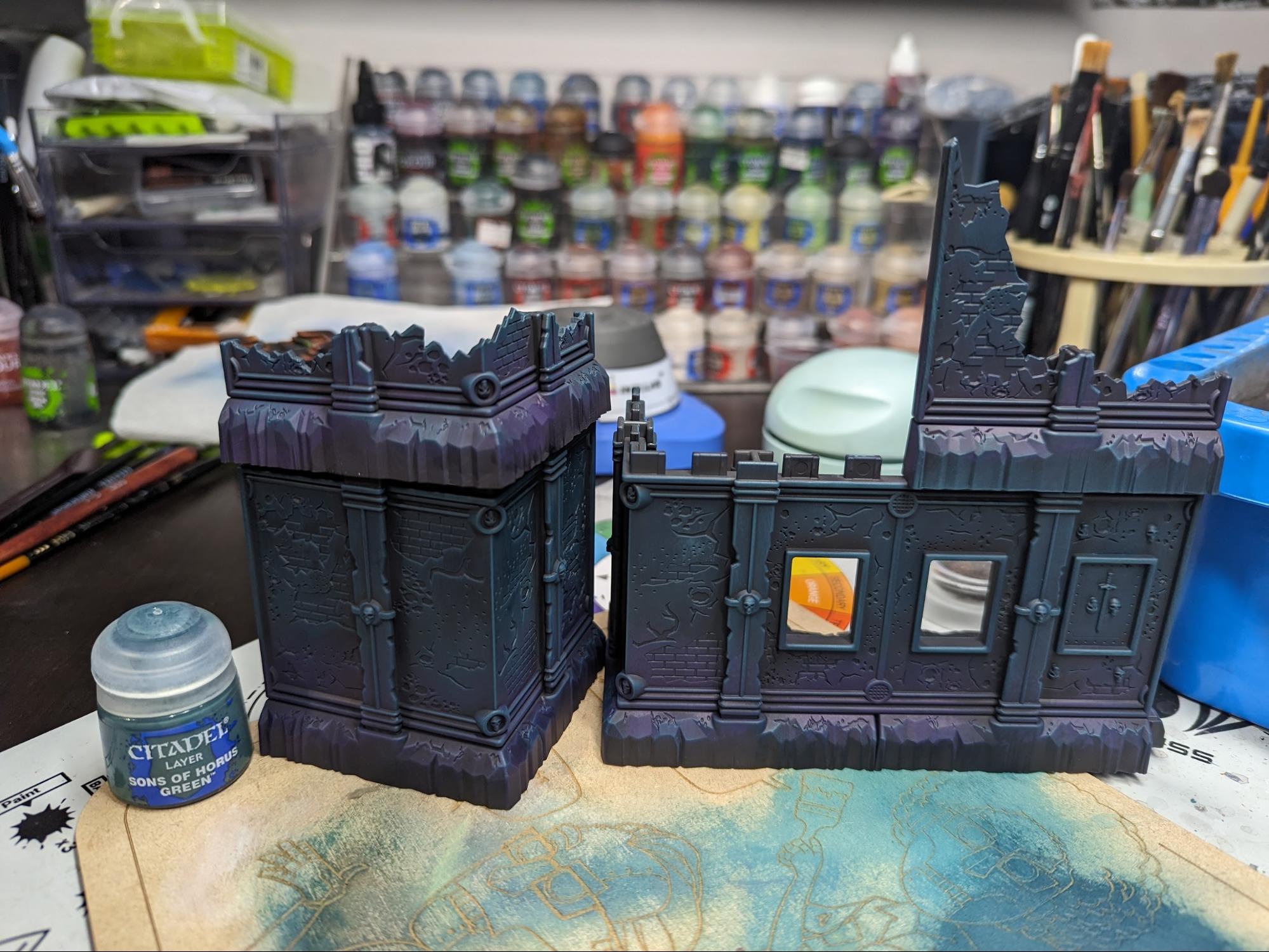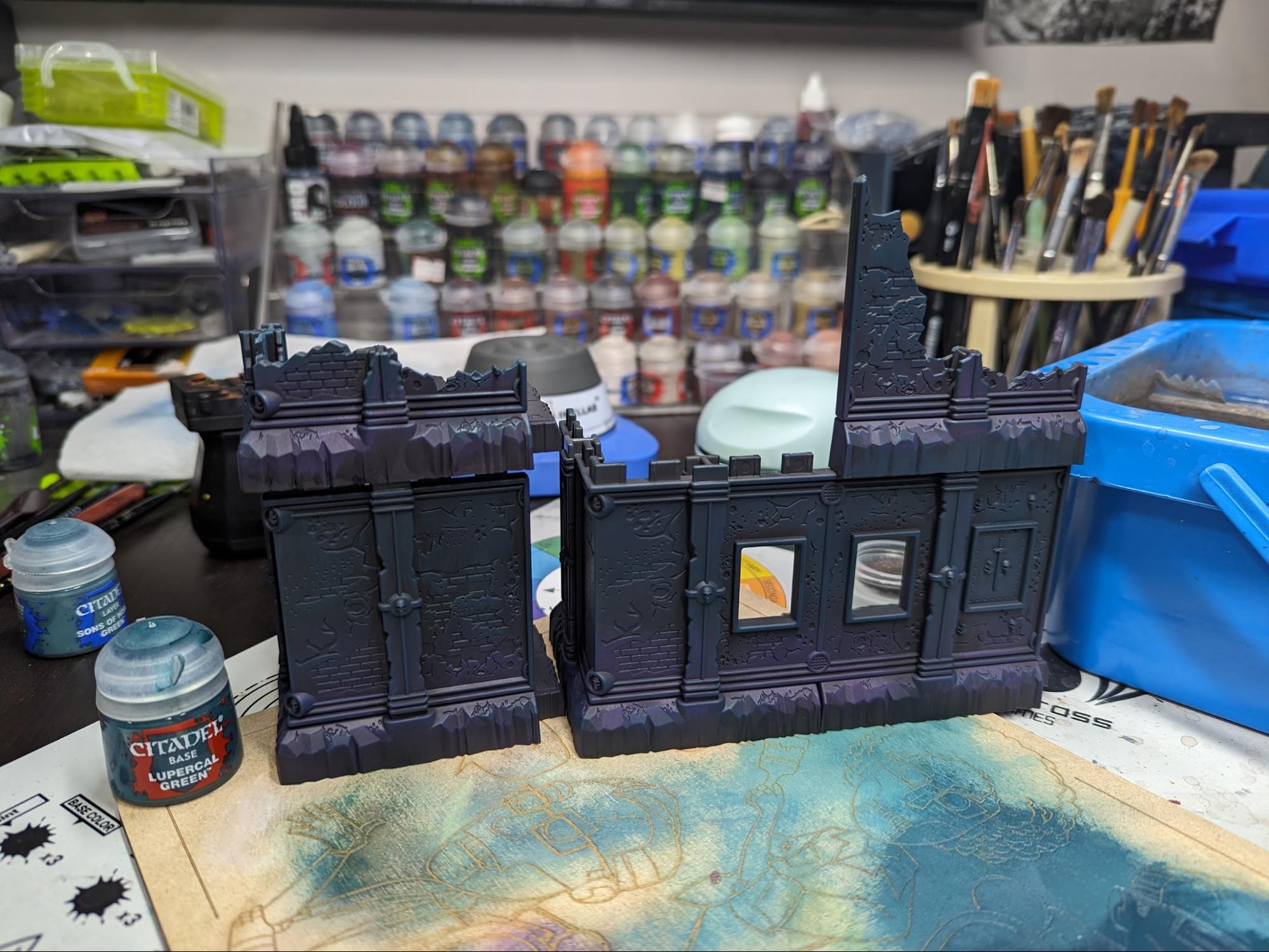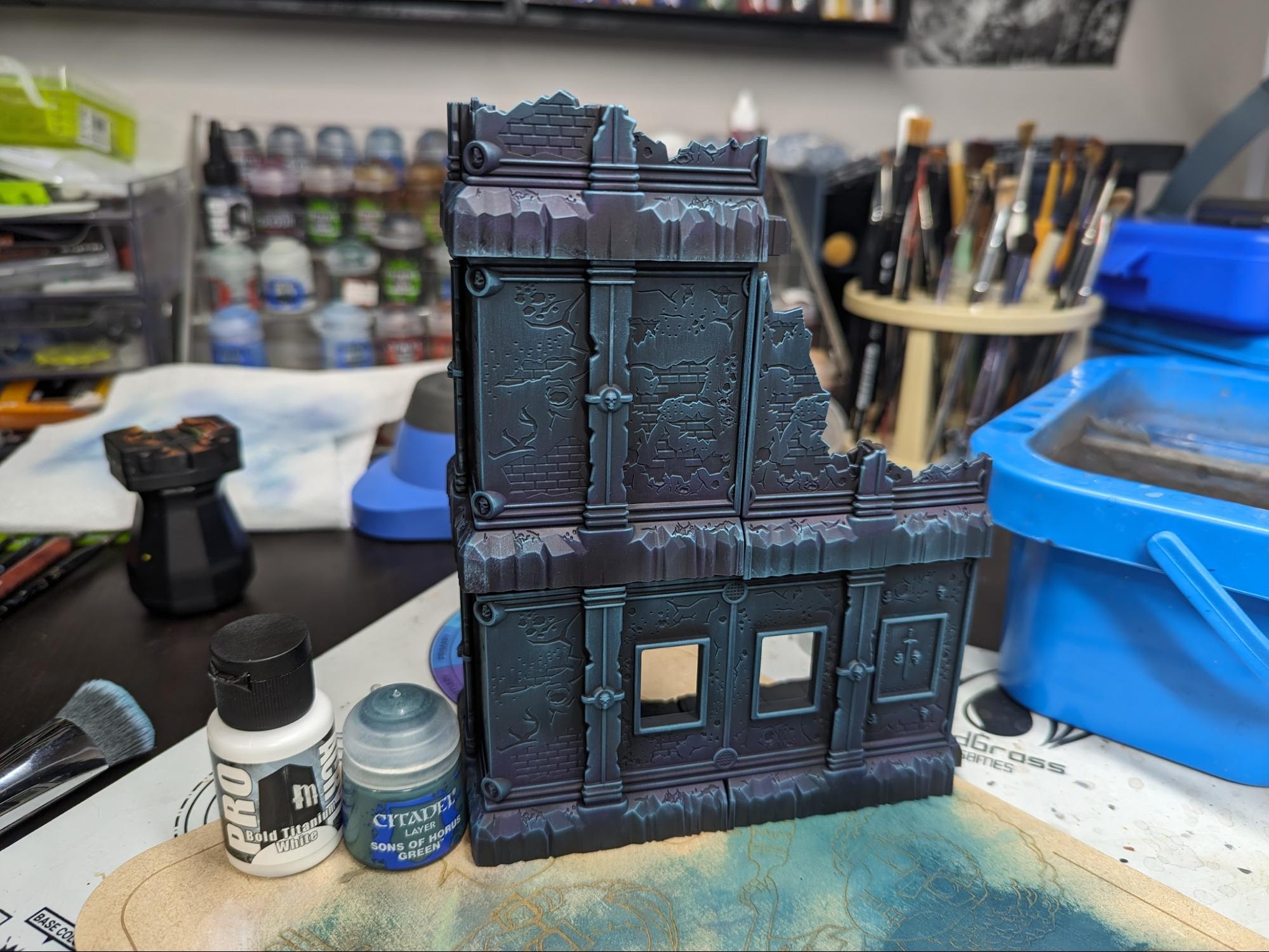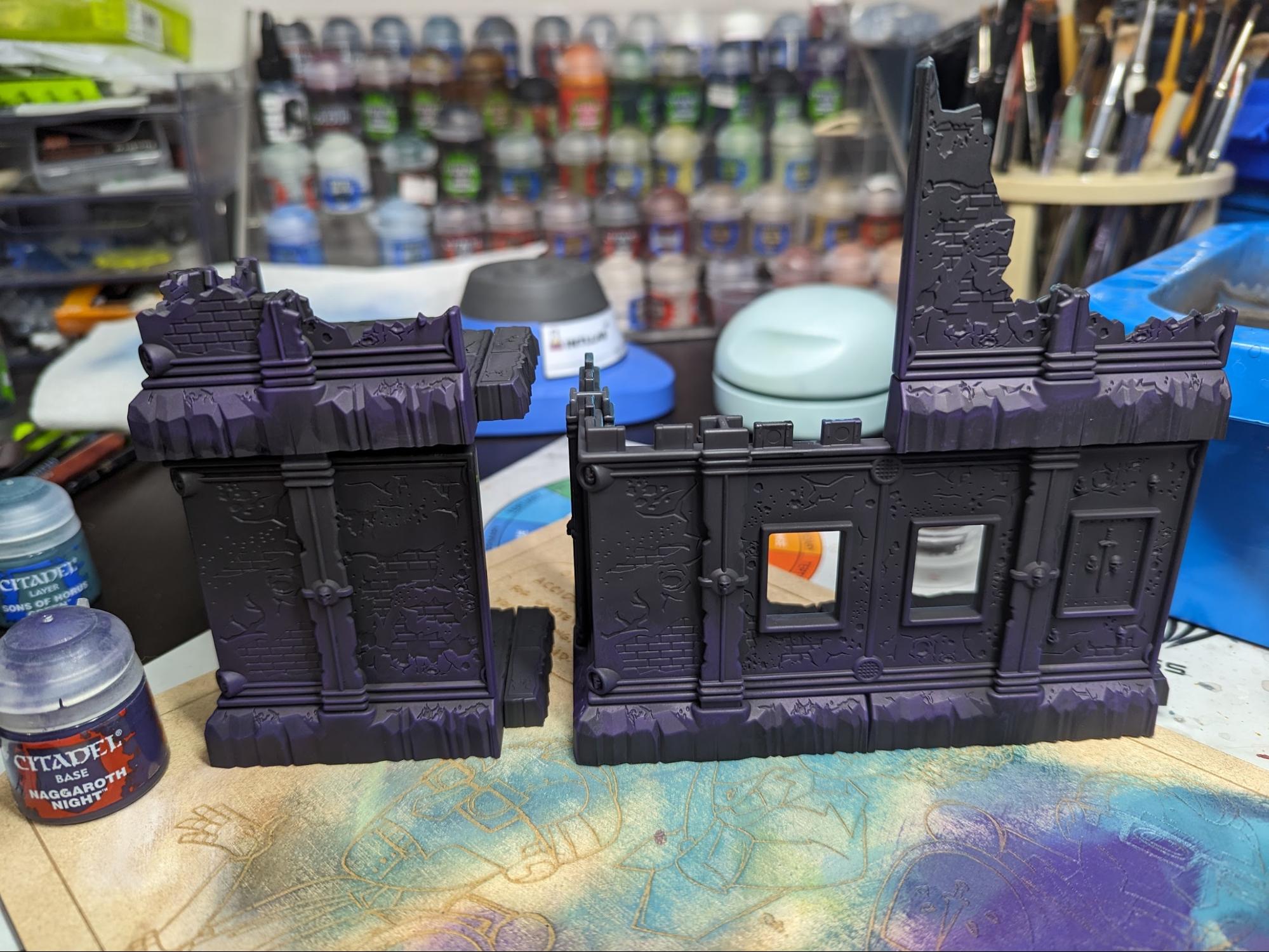 The entire model is primed black, then I use a heavy drybush/stippling motion to coat the bottom half of all the wall pannels with Naggaroth Night.