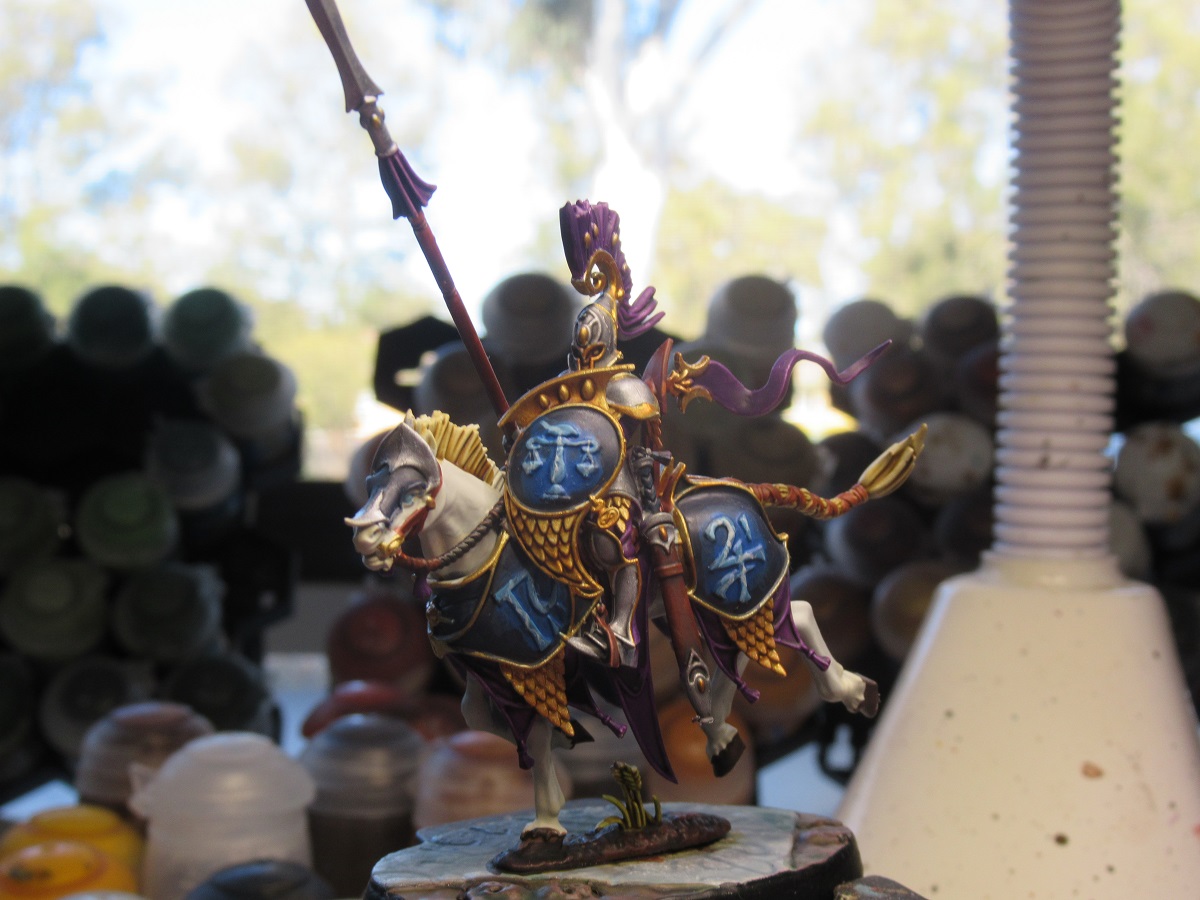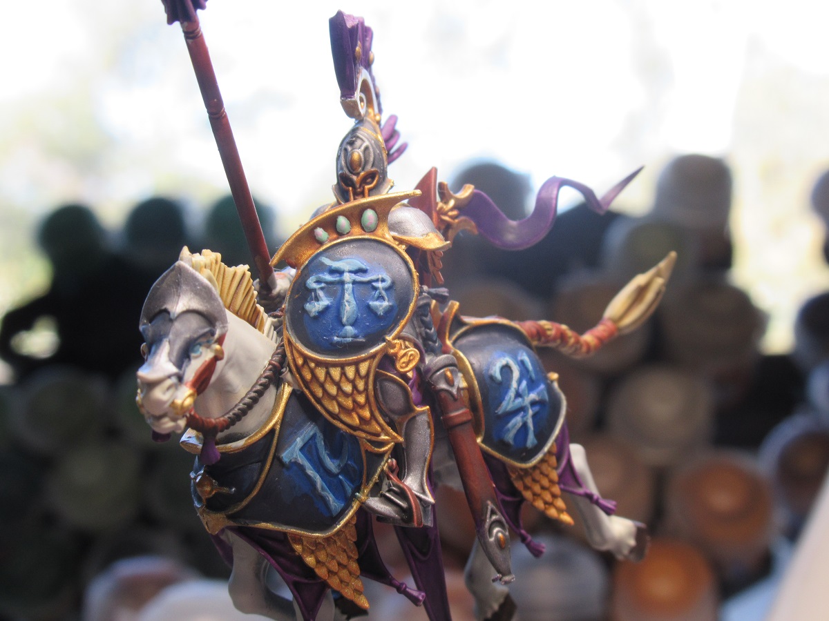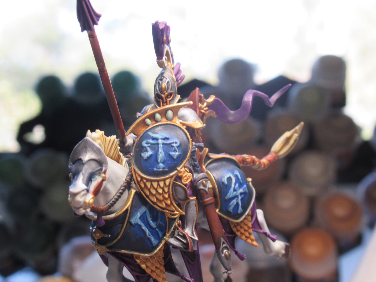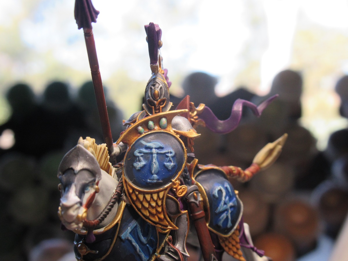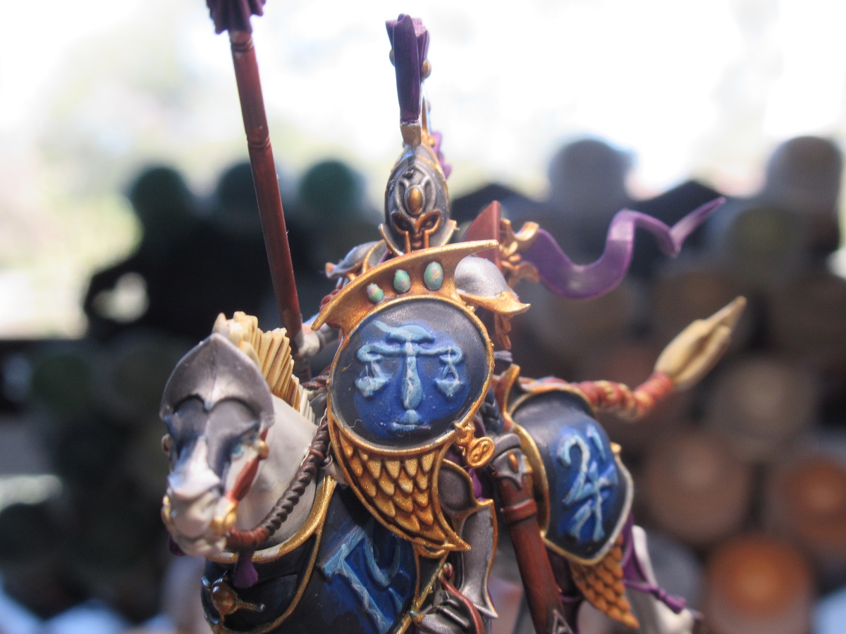 This is more a roughly replicable method for a army rather than something spectacular for a single model, but I think the end result is fairly decent. I personally prefer to start with the darkest colour and build up, I don't really have the art background to tell you which way is better it might just be preference. The idea with gems is to replicate that the light is passing through a object which diffuses the incoming light as it moves further into its depths before it finally reflects off the inside of the gem, this is why they are often highlighted in the opposite direction to the rest of the highlights.