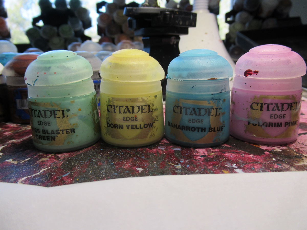 I picked a collection of pastel colours from the formerly-known-as-Edge-paint line. With these small ones four is plenty, but for a larger one add in Dechala Lilac, Blue Horror or any other paints that catch your eye. We're being random, organic and painterly here so you can be creative and messy.
