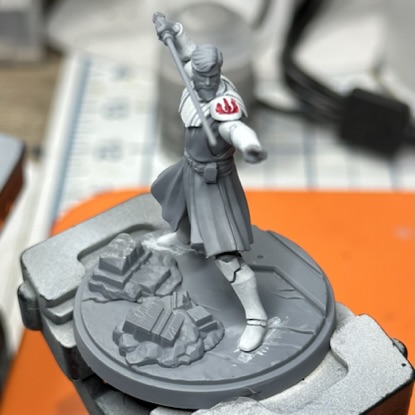 Painting lightsabers themselves is notoriously tricky, as they're seen on screen as white rods with colored diffuse glow around them. That's basically impossible to paint on a miniature. To capture this I decided to pick a fixed reference point, from that angle the lightsaber would be white and from all others it would be blue, darkest on the side opposite of the white highlight.