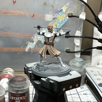 Step one, unpictured, was to prime Obi-Wan in grey. I'm not normally a fan of grey primer and almost always prime in black. I went with it for this model because I wanted brighter colors than I normally pull over black primer, but didn't want to use straight white primer because I'm currently having a good run of mental health and didn't want to hate myself.