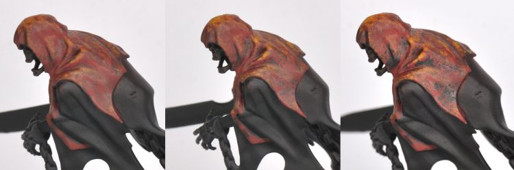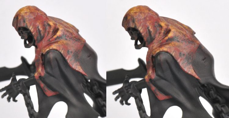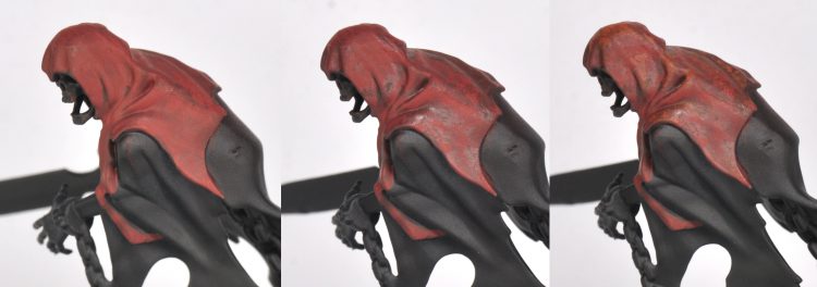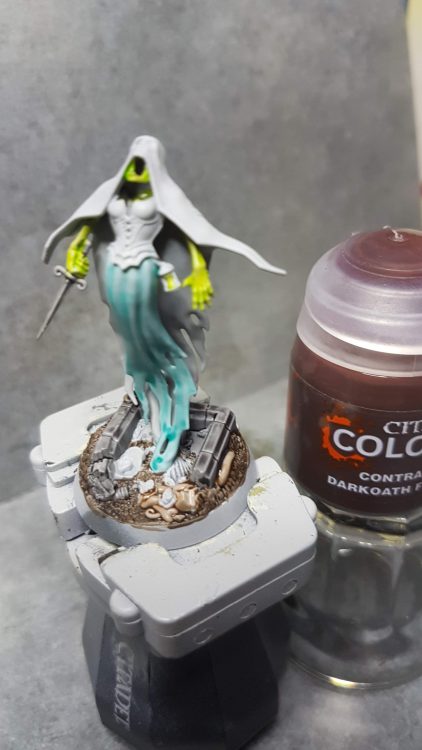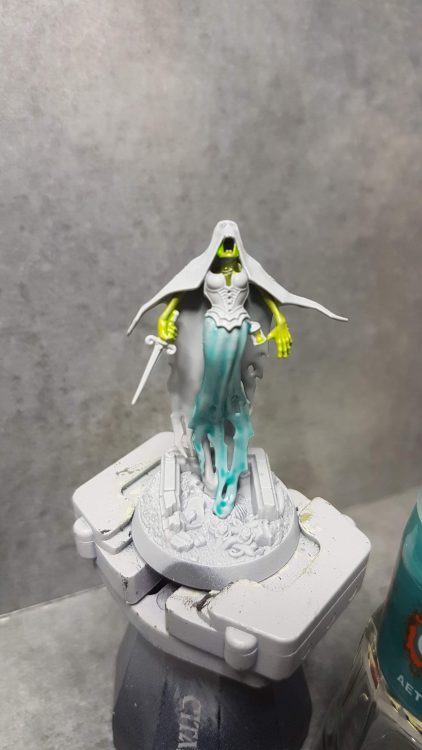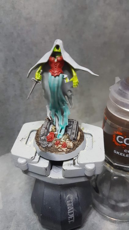 Step 4- Turquoise streaks & stippling across ectoplasm and finer edge highlight. Coal Black is then streaked across center of ectoplasm, used as a targeted recess shade between hood and robe, and streaked into the deepest creases in robe and shadows. Khorne red hitting the most raised creases and light facing angles. Finer highlight of skin and skull.