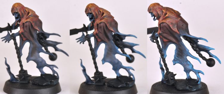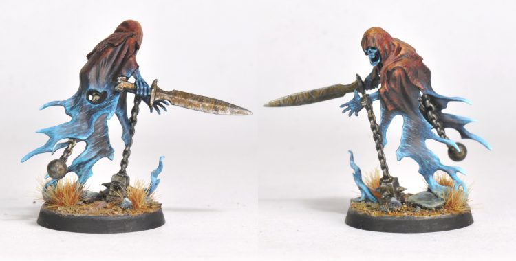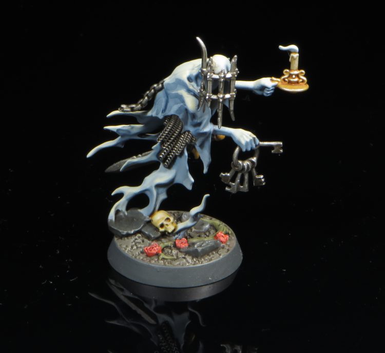 Hit all of the ghostly-bits with Nighthaunt Gloom, allow to dry, and then do a coat of Black Templar contrast over the cloth portions.