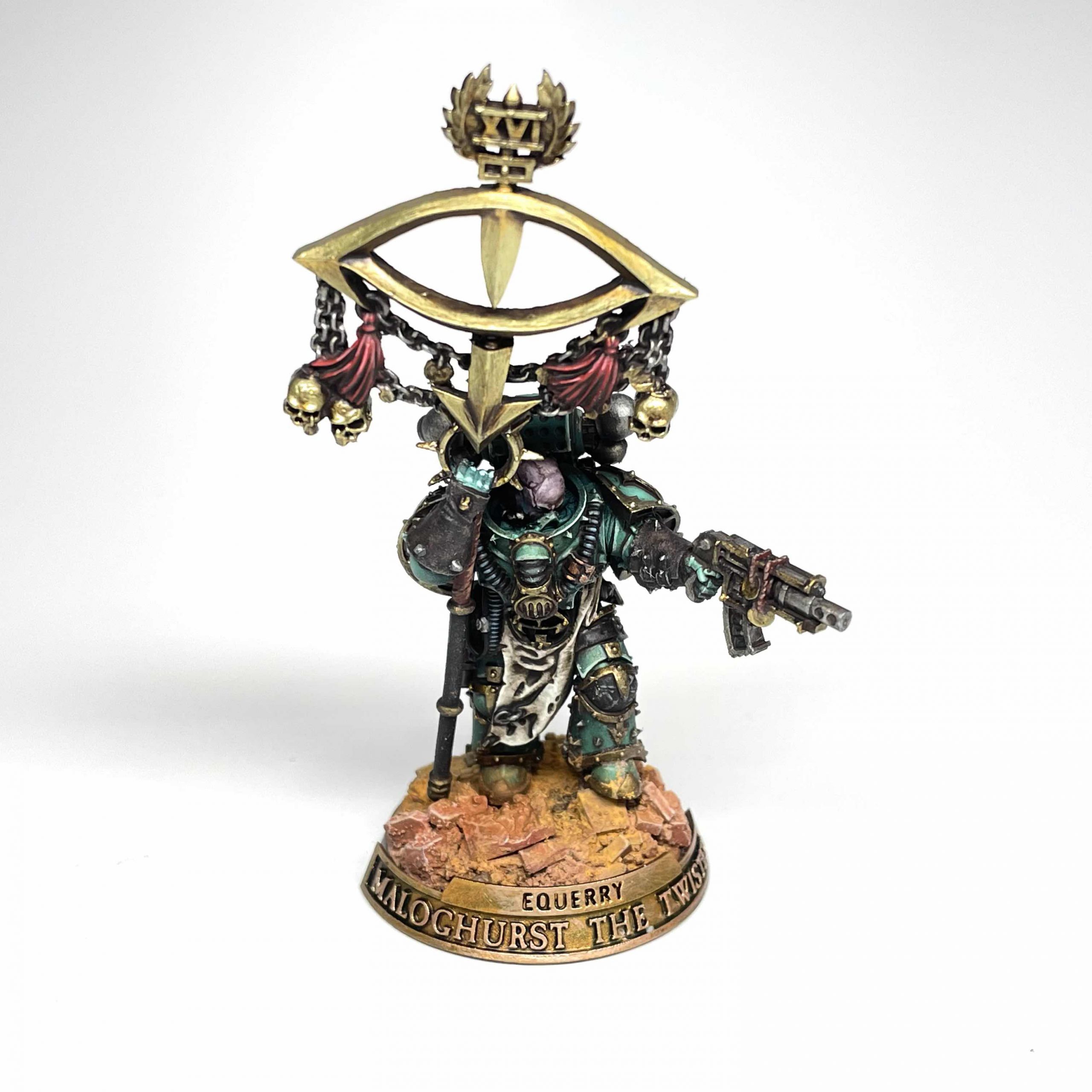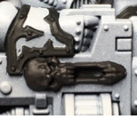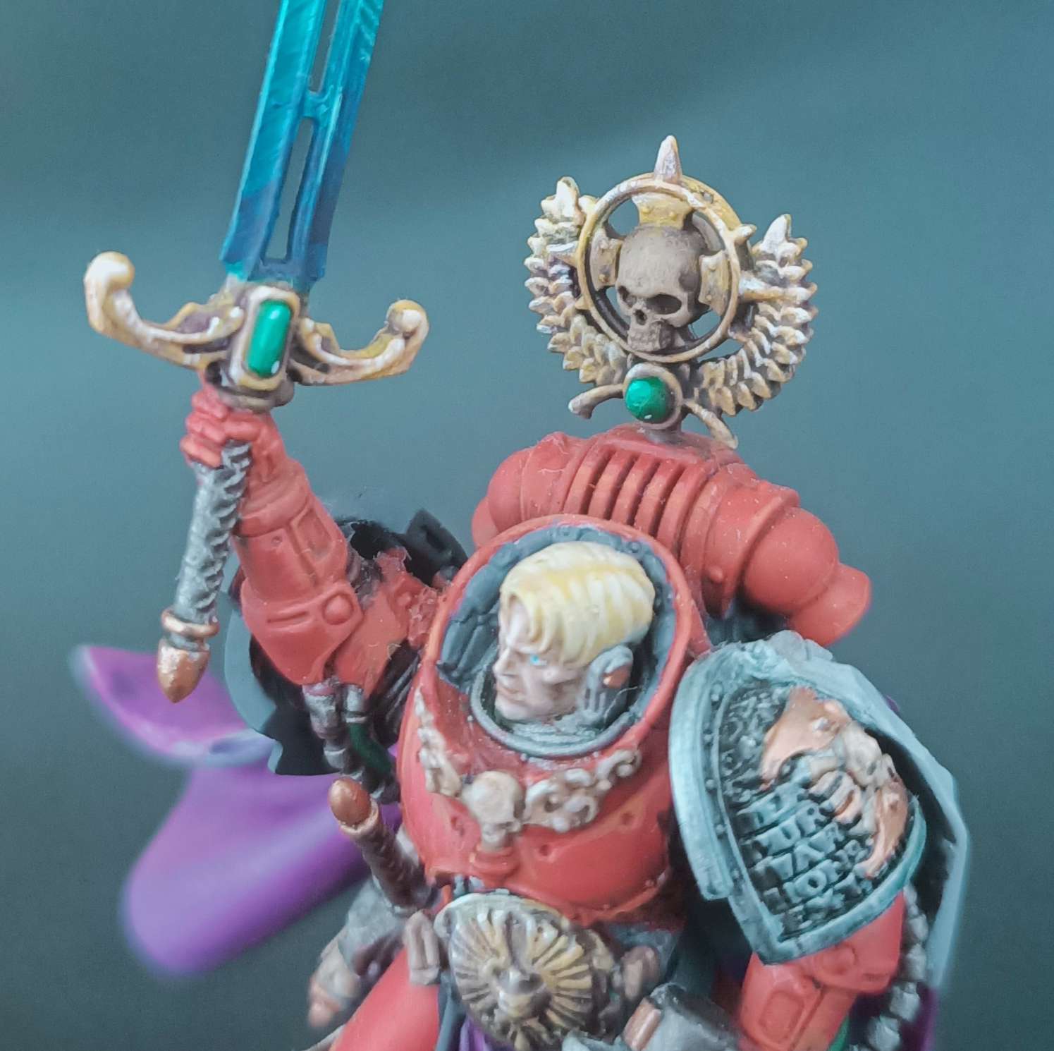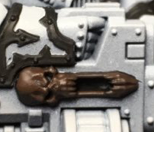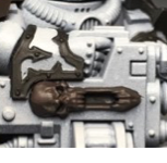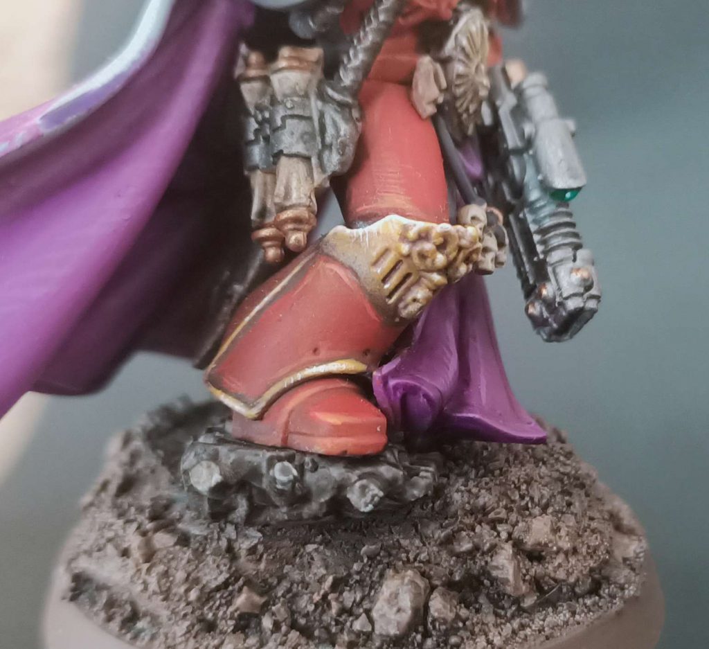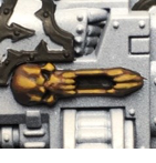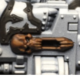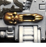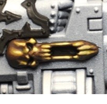 Retributor Gold. You can most easily tell where I did this on the upper eyelid on the lefthand side shoulder pad - I don't want a blotch of Agrax wash sitting there so I came back and painted the whole lid.