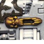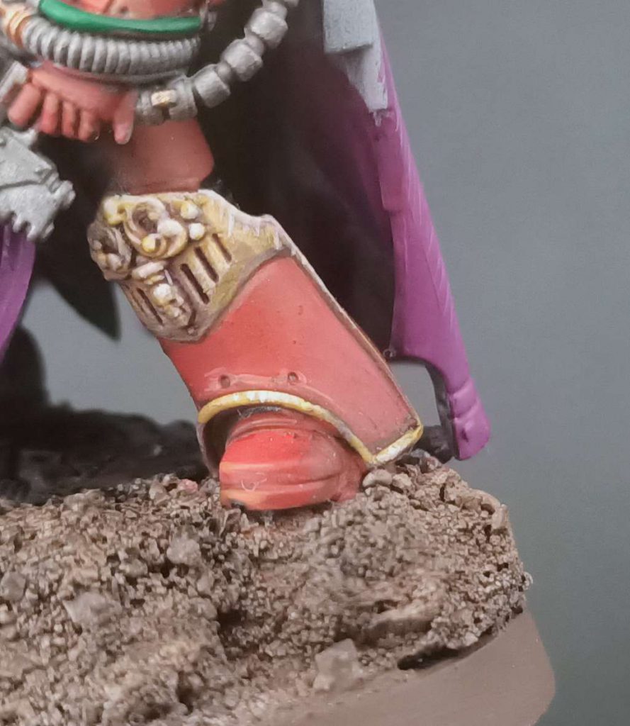 The final step is three stages of highlights: First I hit raised areas that are larger spots with the base trim color, in this case
