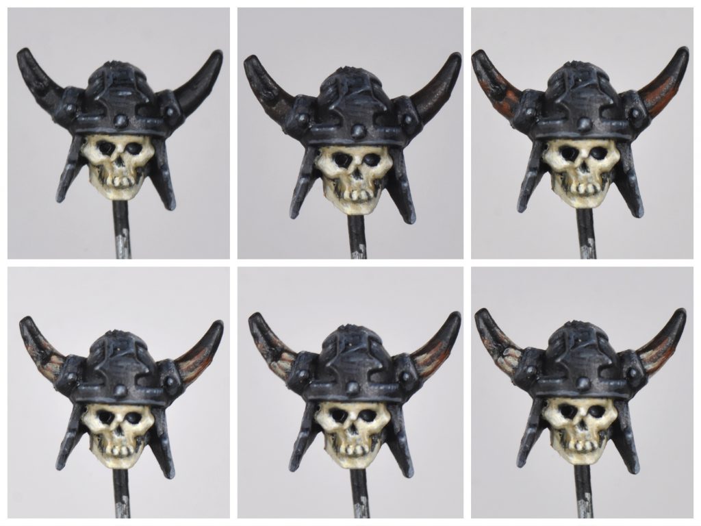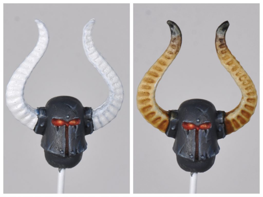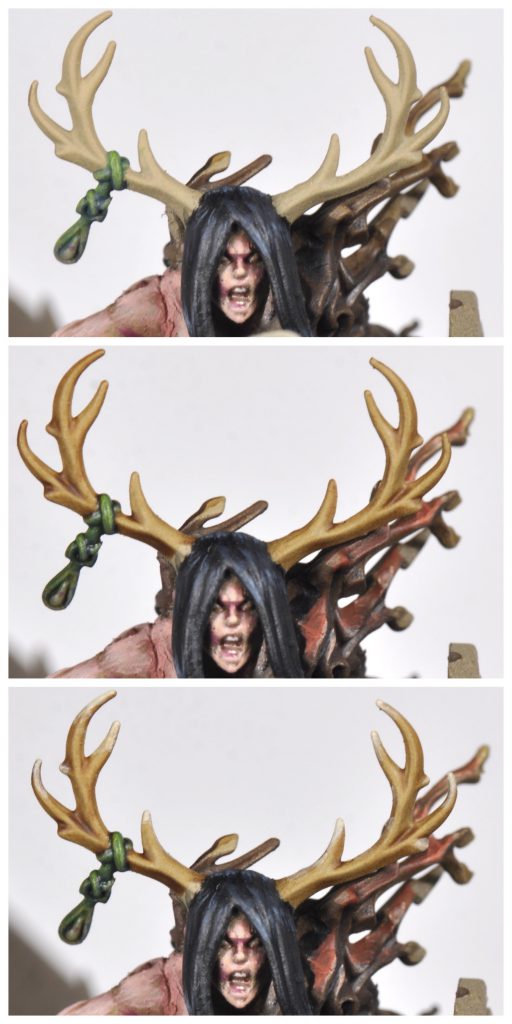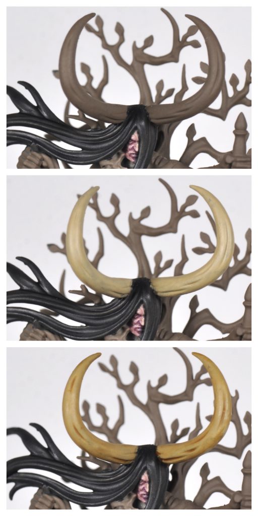 Middle image: Citadel Ushabti Bone highlight along top edges of horn and ends.