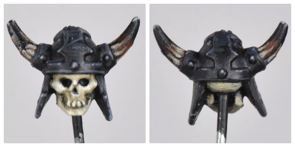 Citadel Ushabti Bone is used as a highlight layer, broadly over the surface area facing upwards (top image). Finally Citadel Screaming Skull is applied on ends of horns facing upwards and on the top facing horizontal surface towards the base of horns (bottom image).