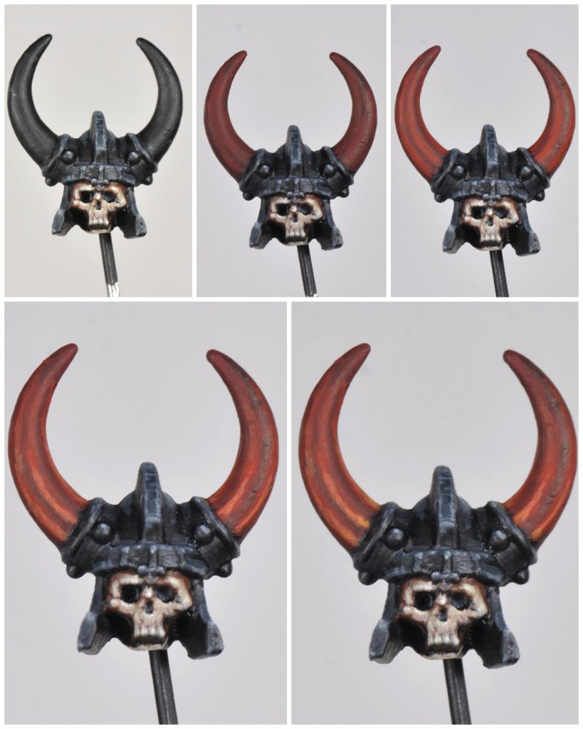 Bottom left: Citadel Wild Rider Red layer over previous layer, in thinner stripes, going from base to partly up horns.